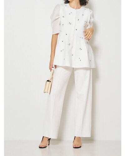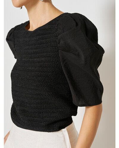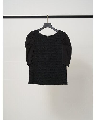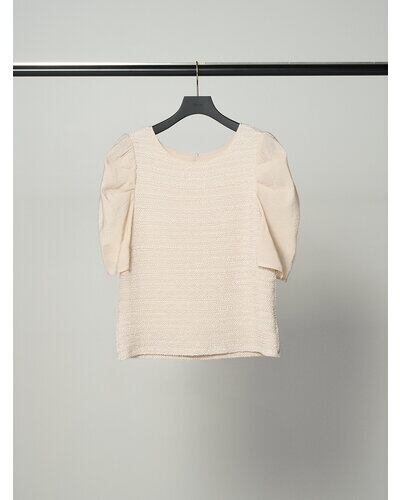身頃はシャーリング加工されたカットソー素材を使用し、袖はブラウス素材を使用したパフスリーブプルオーバー。