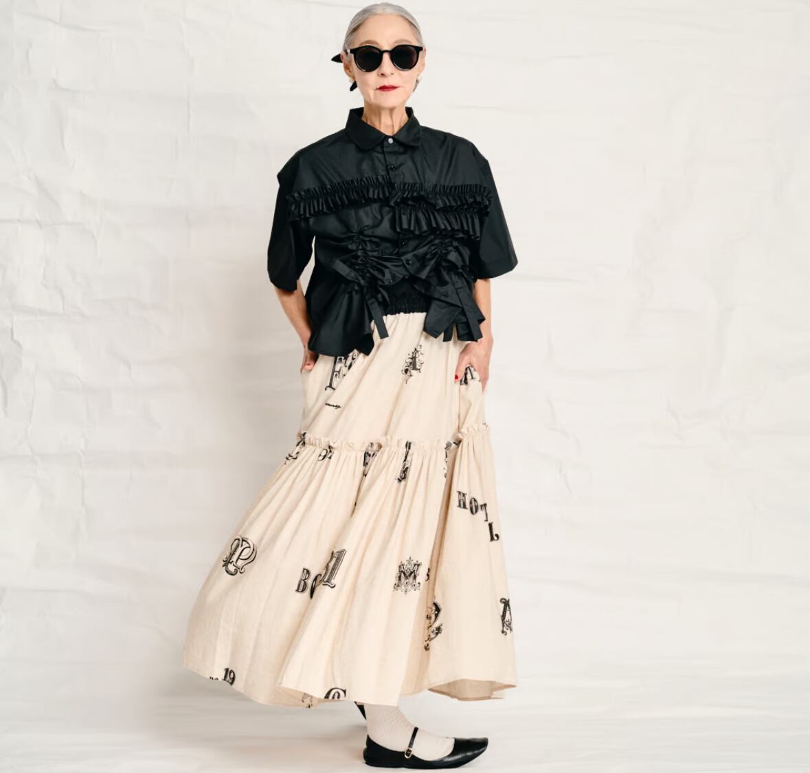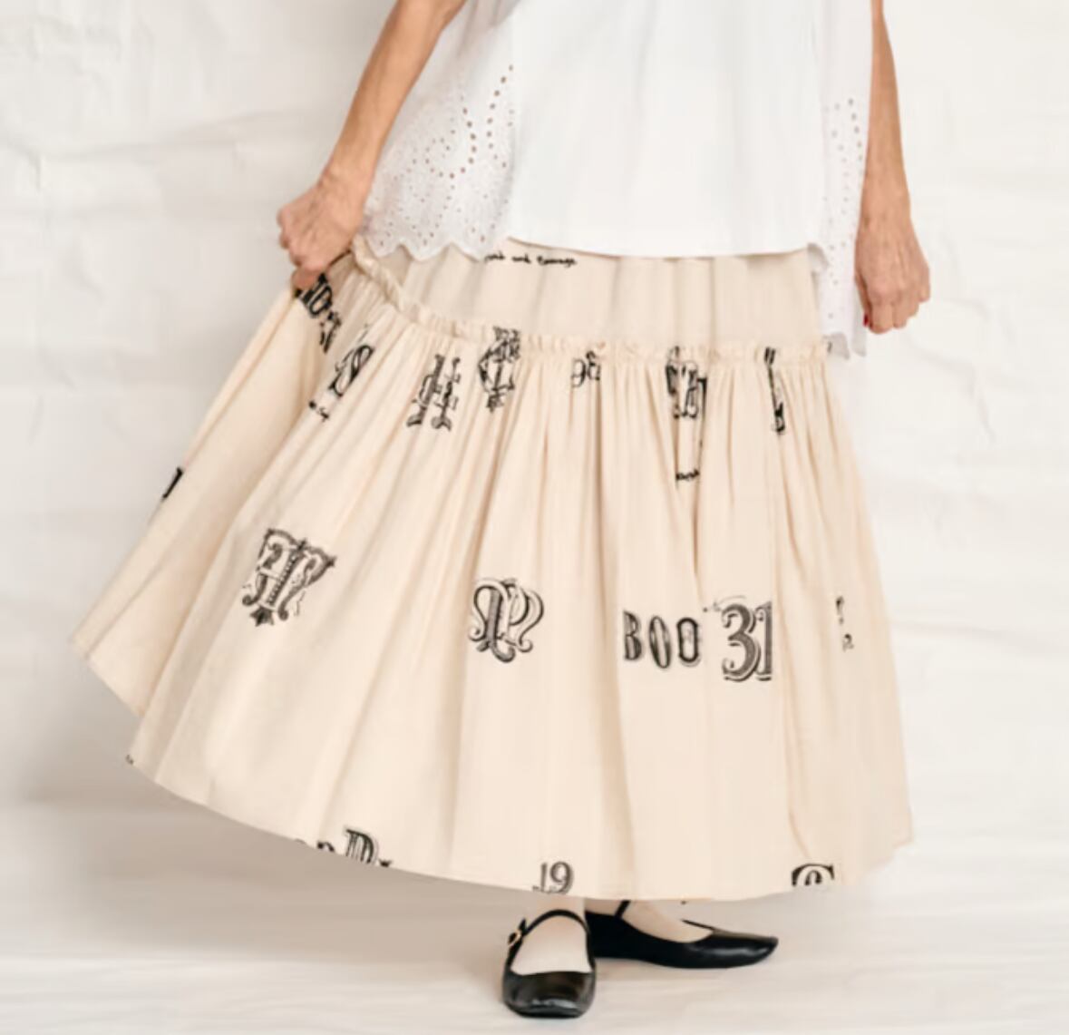 ギャザーたっぷりの贅沢感のあるスカートです。これでもかと言うほどのギャザーがガーリーでとても気に入っています。ヒップの部分はギャザーを少なくしてスッキリ見え、ヒップ下からフリルのように縫い代を出してギャザーを作っています。着丈は長めです。サンプルサイズは38の長い丈。36は5cm短くなります。ウエストは総ゴムでブラックのリネンに色を変えていて総ゴムながらウエストベルトを見せて着てもサマになります。柔らかなゴムなので、着丈で選んでいただいても良いかもしれません。38サイズの方が蹴回しが広くなり、たっぷりとして見えます。両サイドにポケット付き。春夏の暑い日に着ても涼しく合わせやすく便利に着こなしてもらえそうな1枚です。ジャケットとの相性、バランスもとても良くセットアップもとてもお勧めです。トップにはシャツが好相性でした。ベージュのストライプシャツでも、予約受付中のドローストリングのギャザーのホワイトシャツにも合わせやすかったです。ほどよく柄がポイントになっていて、単色のような使い勝手ですが、オシャレ感のあるアイテムが出来上がったように感じています。素材のナチュラルさも魅力的でとても大好きなスカートになりました。