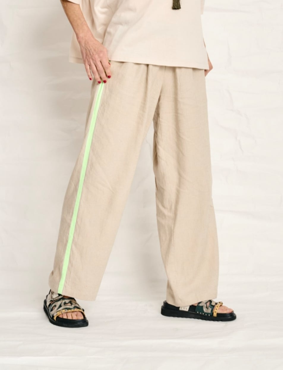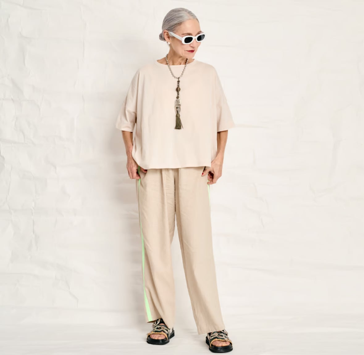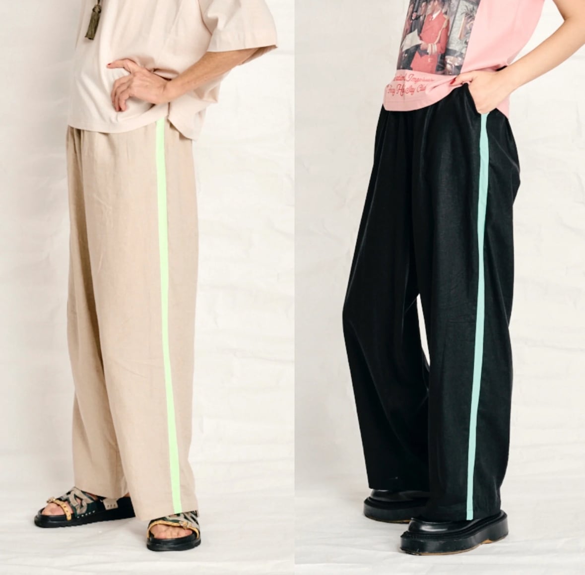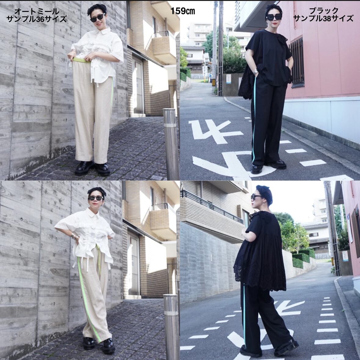 これまでも、よく出しているタイプのオーバーサイズイージーパンツです。ウエストはゴム+ドローストリングの紐で絞るタイプにしています。ですので細い方もふくよかな方もカバーする便利アイテムです。最近はウエストにゴムを使わないものを増やしていました。お客様からのイージータイプのサイズを気にしないで着用できるパンツを出して欲しい、というお声が上がったので作りました。ブラックとオートミールの2色展開。オートミールには蛍光グリーンのサイドラインを入れています。ブラックにはエメラルドグリーン。麻のパンツに蛍光ラインが乙な気がします。落ち感がある素材なので下に下がって見えて、下半身がほっそり見える効果があります。両サイド深めのポケット。ウエストはベルトカラーを変えて、ゴムベルトながら、ウエストが見えてもウエストマークされるので安っぽさはあまり出ないようにしています。
