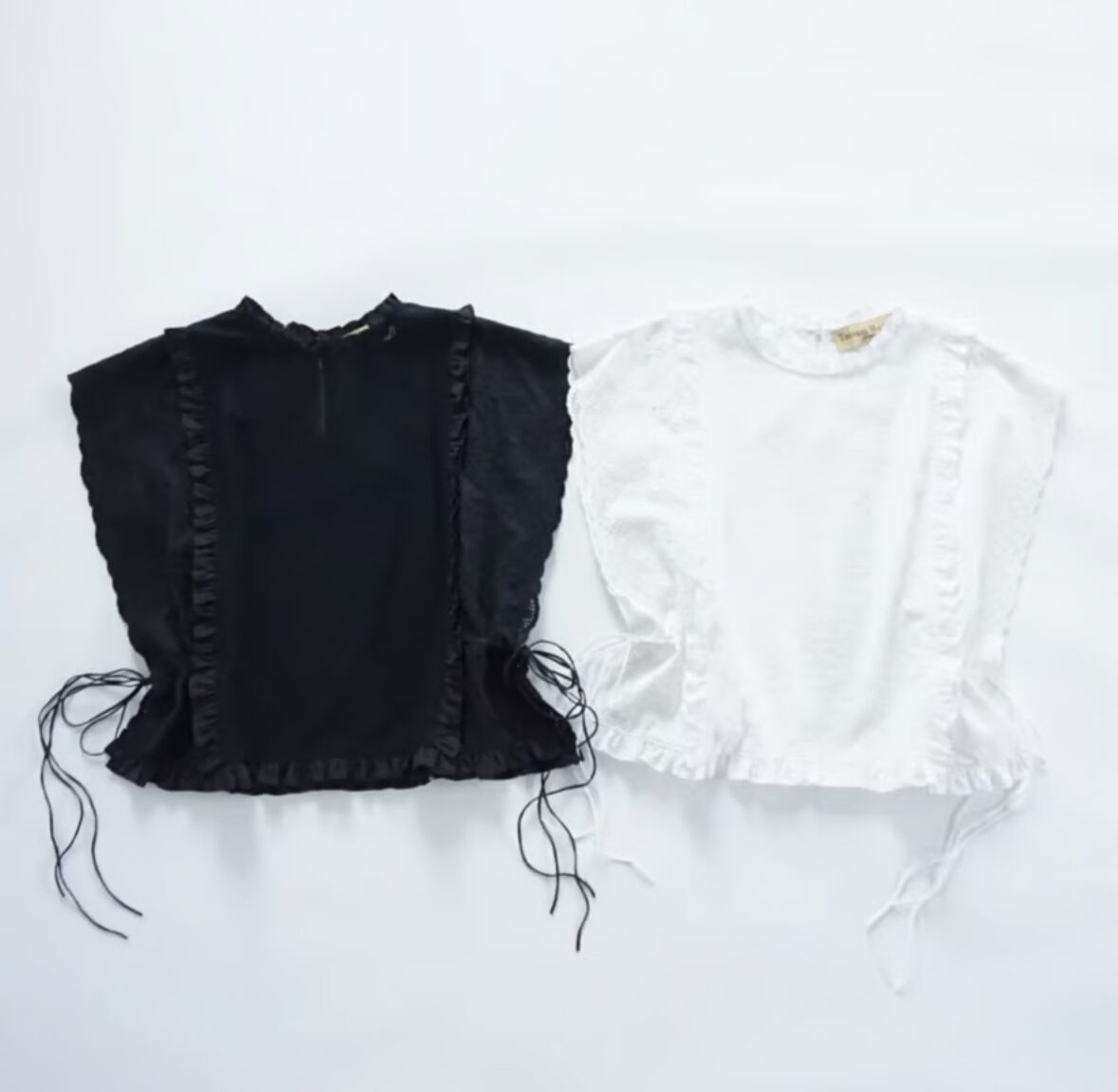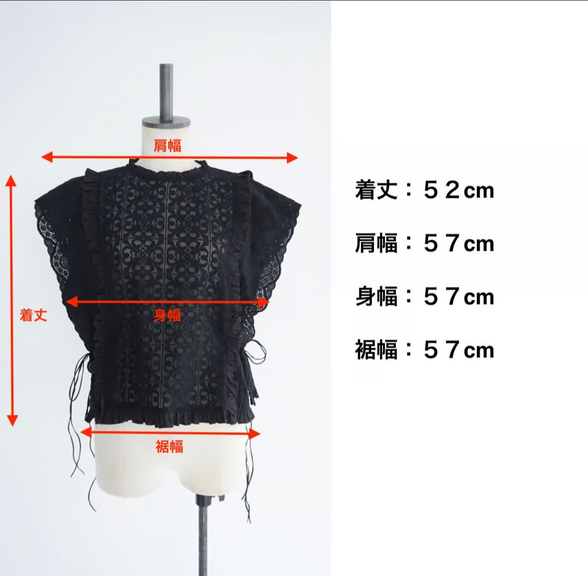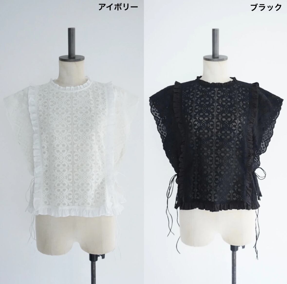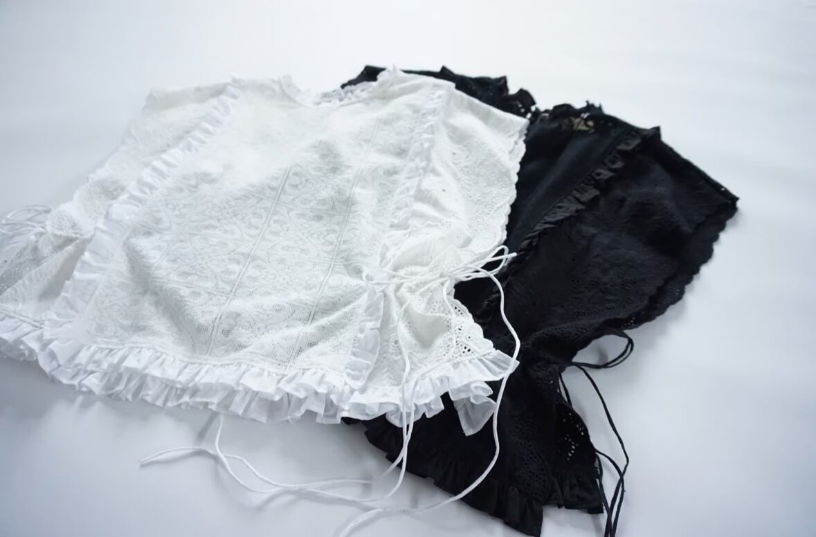 レースとフリルのミックス感がとても可愛いです。私は下に長袖シャツやタートルを入れてオールシーズン着るのはどうかなと思いました。このアイテムはスタッフからの人気もあり、かわいい、という声がとても多かったので予約商品に加えています。サイドの紐はリボン結びにするタイプです。強く縛ればウエストがしまって見えるので女性らしい雰囲気。私は女性らしいよりもカジュアルに着たいので絞らずゆったり目に結んで着たいと思いました。