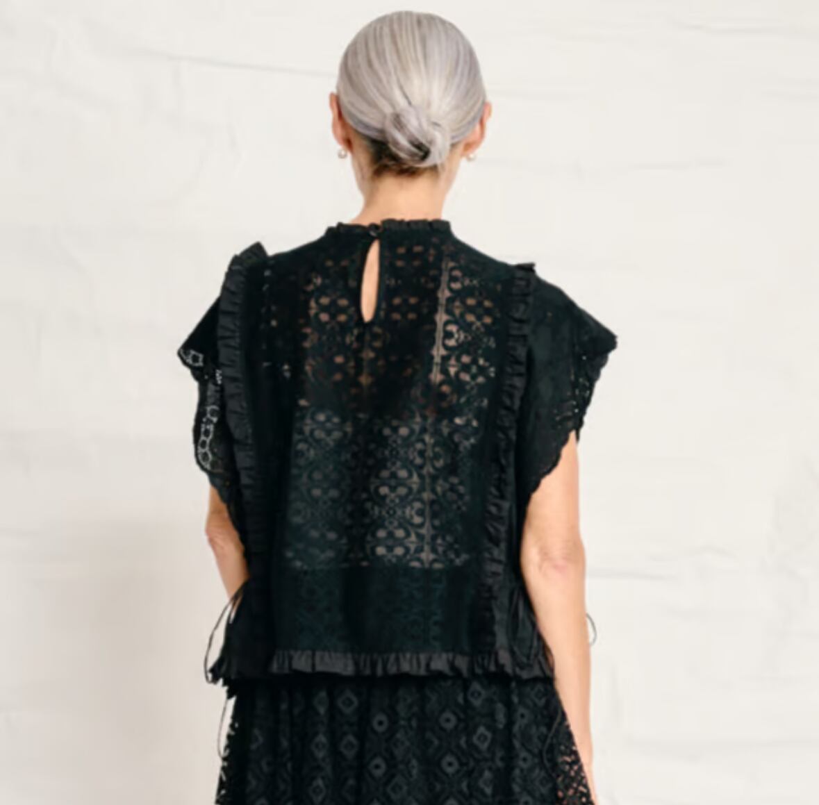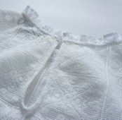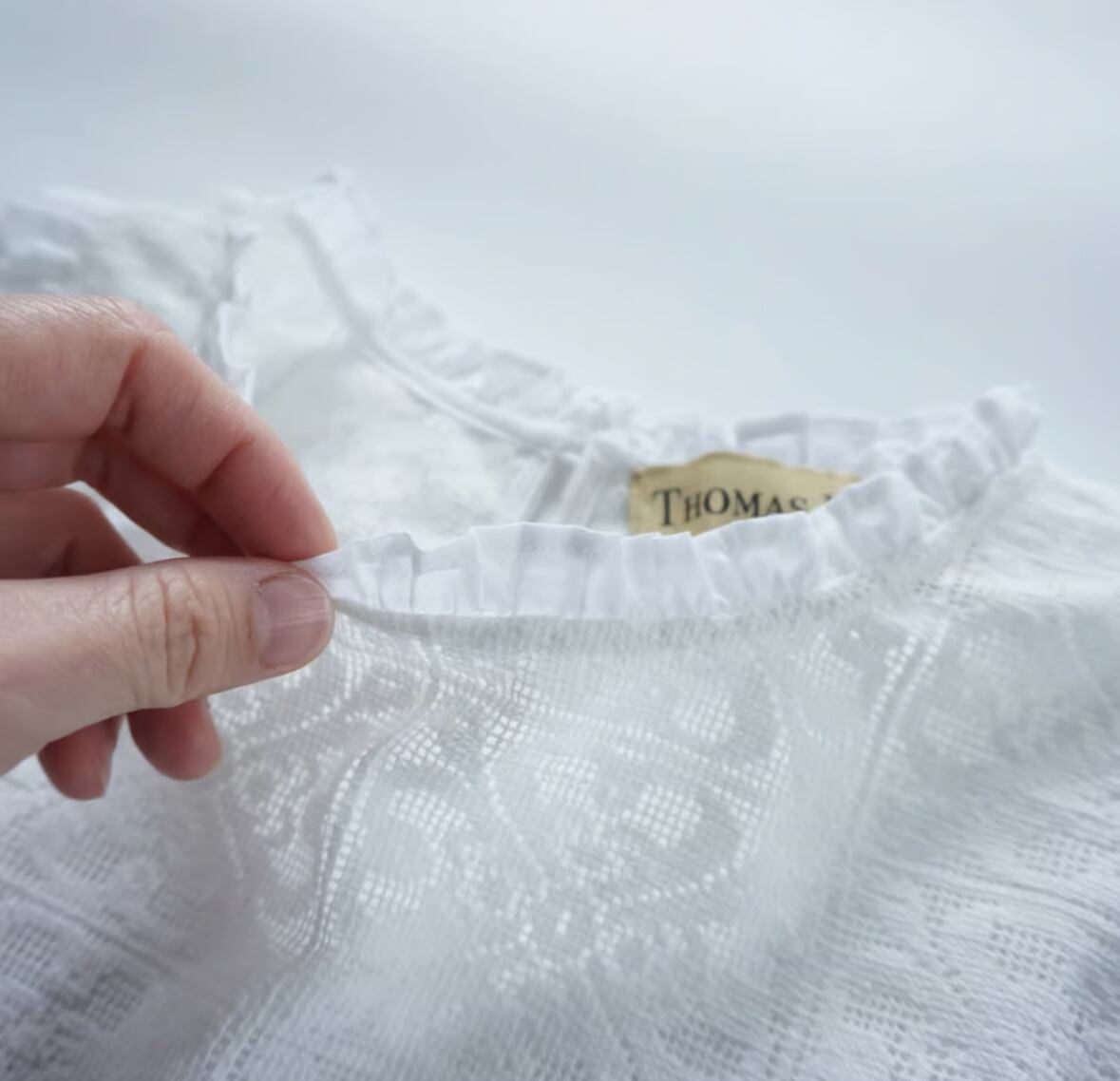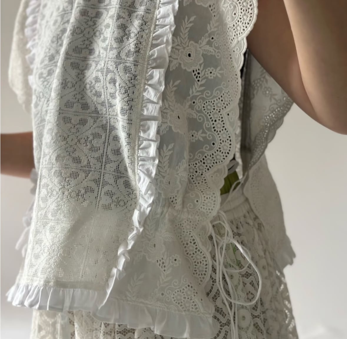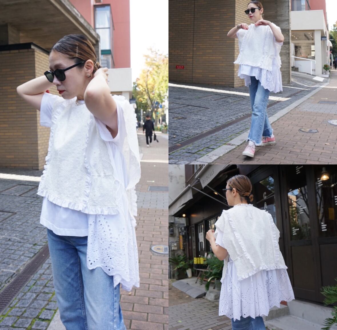 レースとフリルのミックス感がとても可愛いです。私は下に長袖シャツやタートルを入れてオールシーズン着るのはどうかなと思いました。このアイテムはスタッフからの人気もあり、かわいい、という声がとても多かったので予約商品に加えています。サイドの紐はリボン結びにするタイプです。強く縛ればウエストがしまって見えるので女性らしい雰囲気。私は女性らしいよりもカジュアルに着たいので絞らずゆったり目に結んで着たいと思いました。