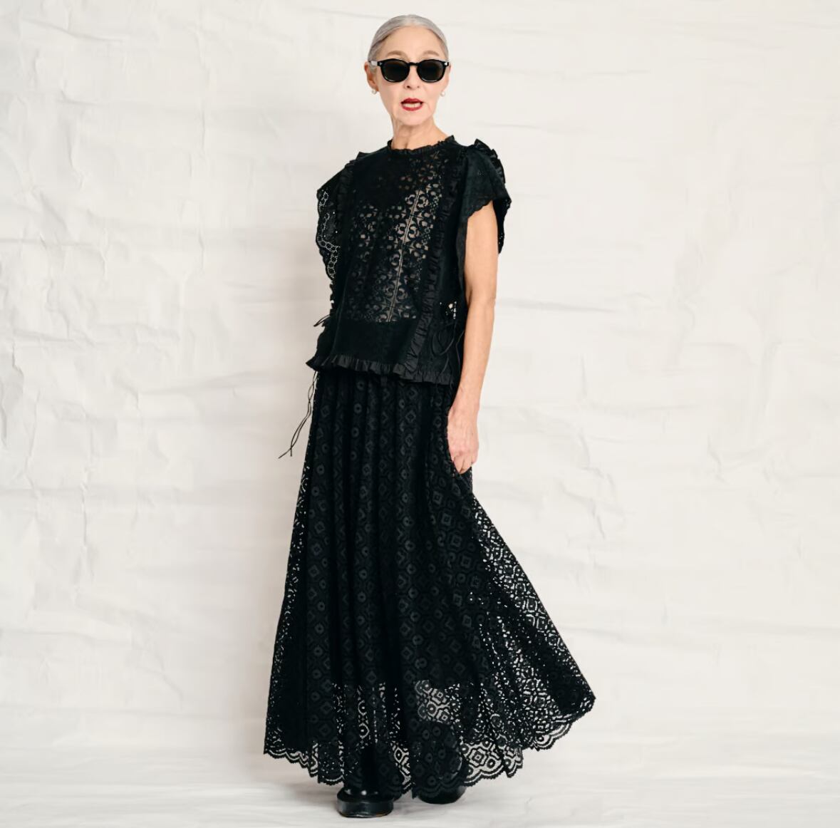 レースのロングスカート、リネンのオリジナルプリントのスカートとも好相性。ぜひセットで合わせてみて欲しいです。