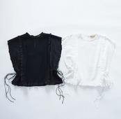 クルーに小さめのフリルをつけた被りのシンプルなトップです。サイドは紐で結ぶタイプでベストのような雰囲気です。ノースリーブですが、身頃が大きめになっているので肩も大きめ。ノースリーブながら、フレンチスリーブのように肩から腕にかけて生地がのるので、ノースリーブより着やすく、二の腕が気になりませんでした。サイズはありません。サイドが開いているのでどんな体型の方でも着用が可能です。