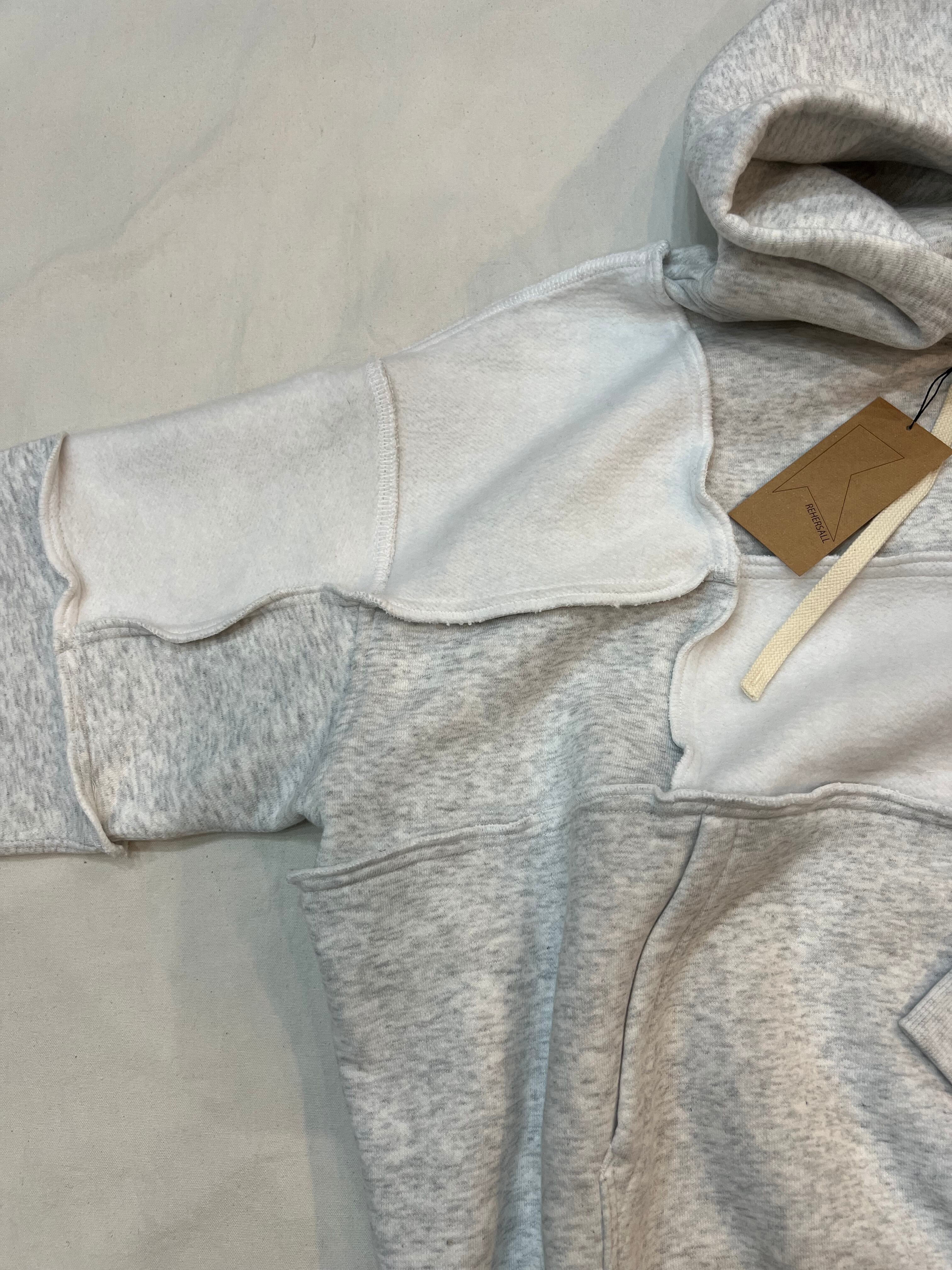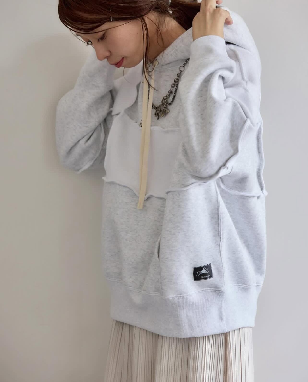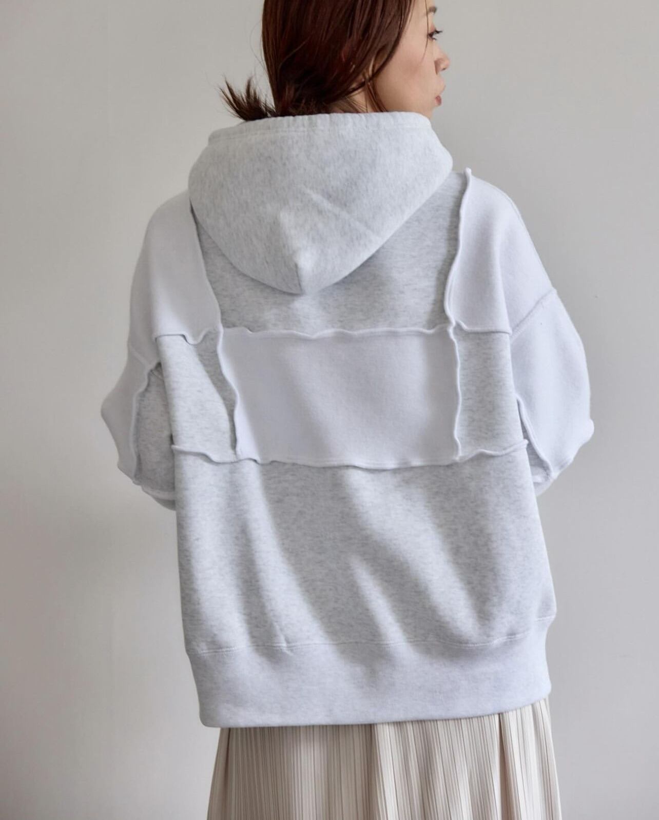 パネル毎に裏と表を互い違いに組み合わせたシンプルながらも一癖あるリハーズオールさんらしいスウェットパーカーです♪