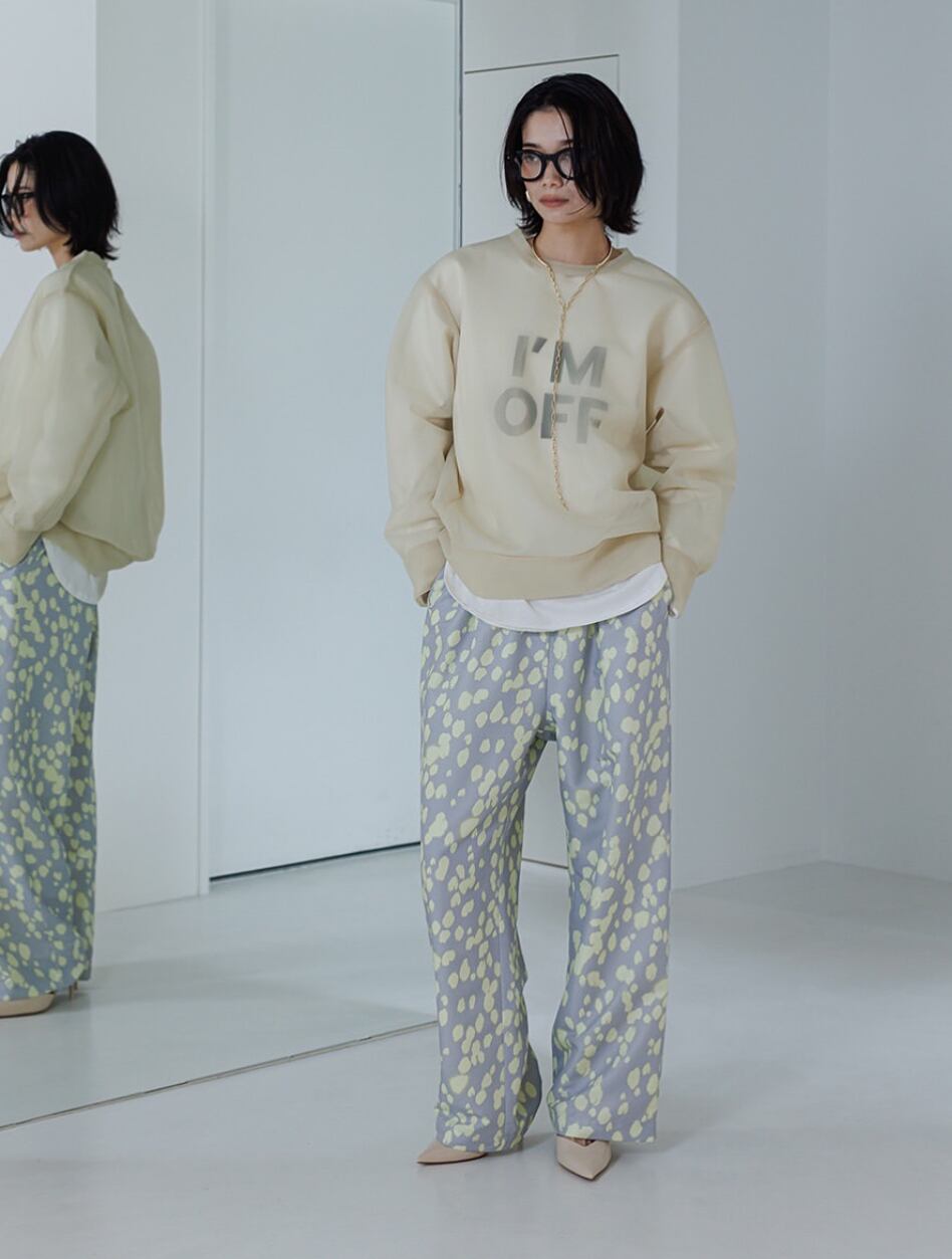 カラーリングも女性らしい印象に。シルエットは定番のパターンを採用し、きちんと感もありつつもウエストはゴム仕様でイージーな着心地を実現しました。
