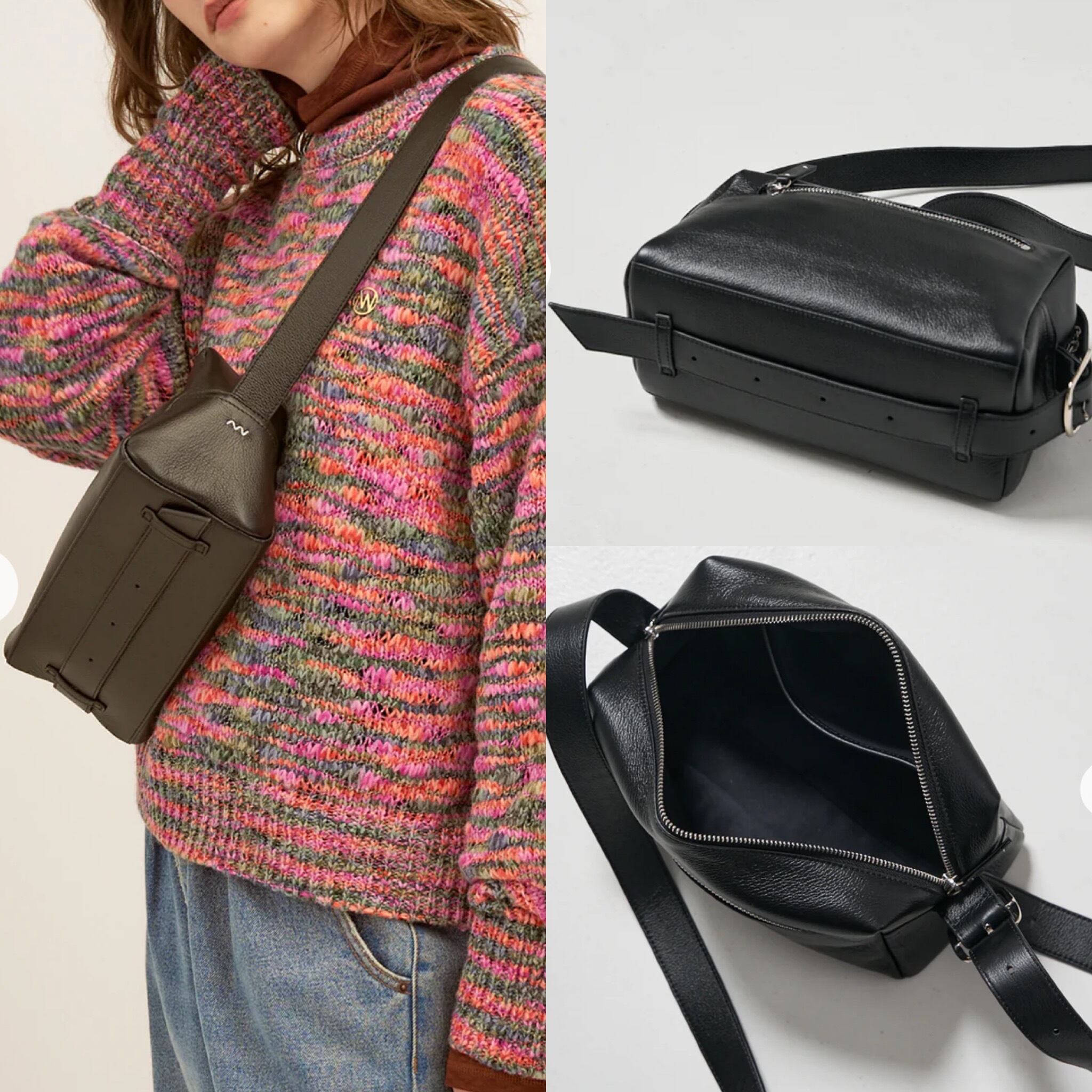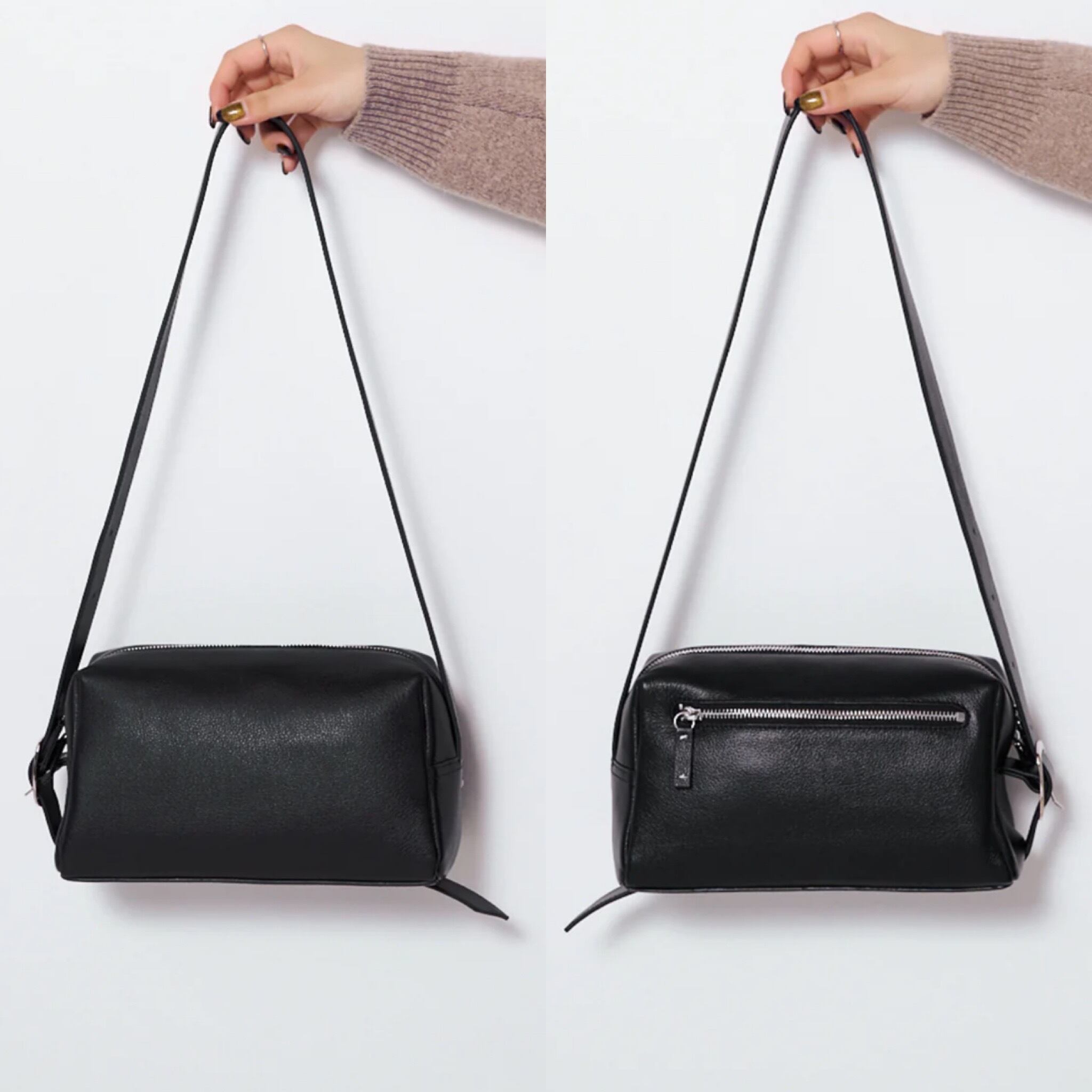 長めのストラップはそのまま垂らしたり、底に配置したベルトループに収納したり、デザインのアクセントに。