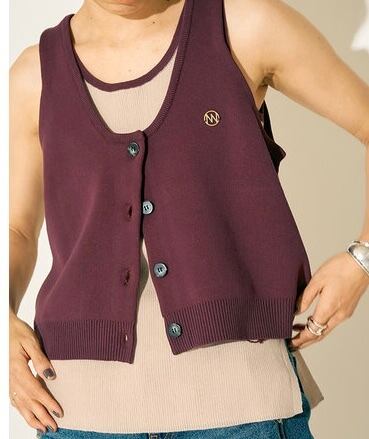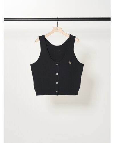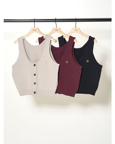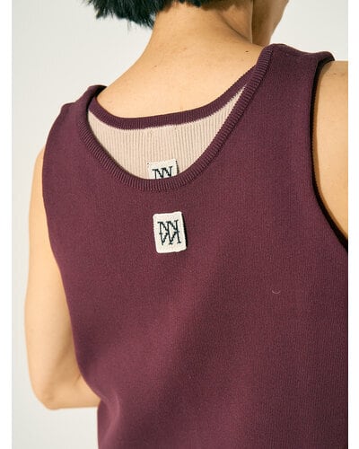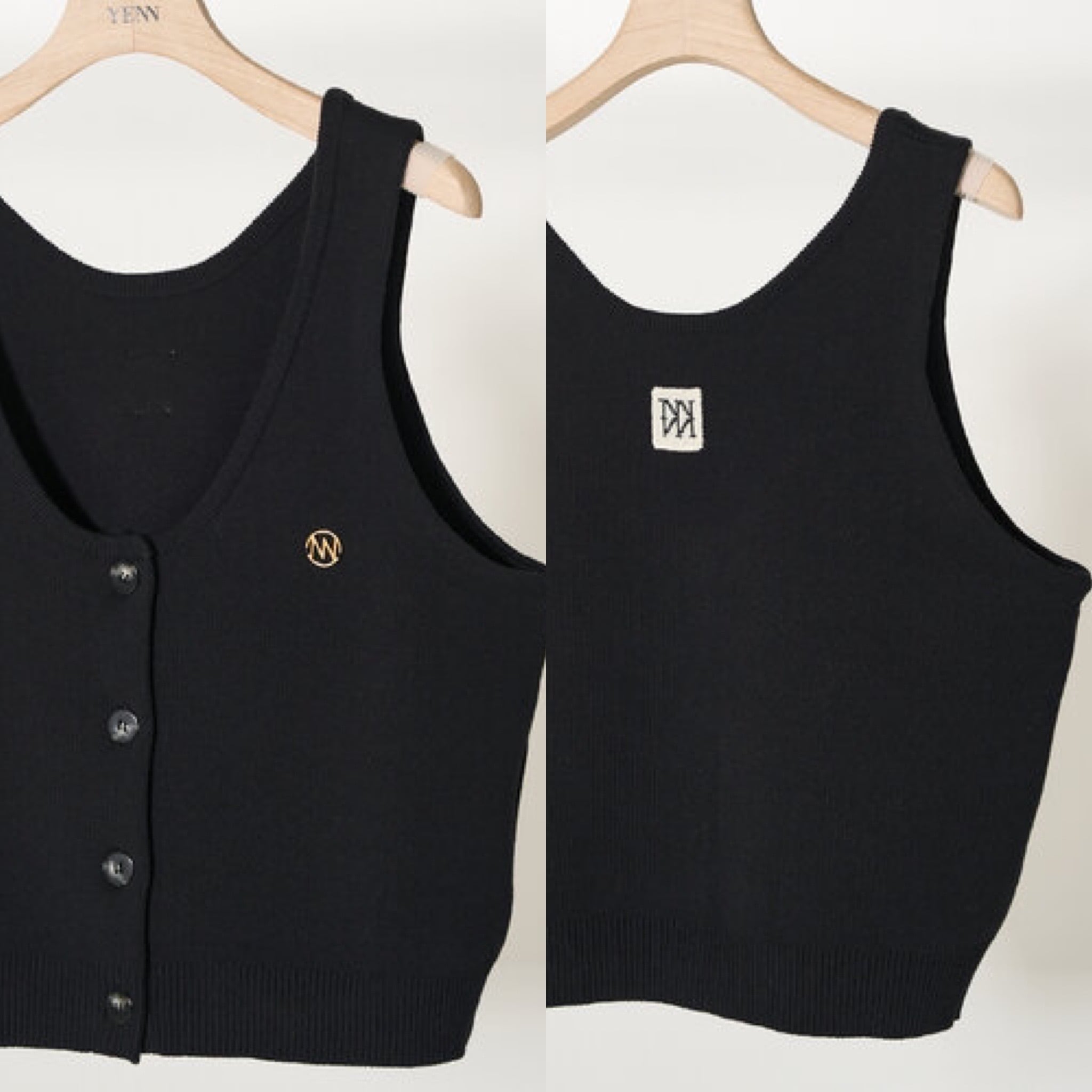 前は深めにあいたネックのベスト、後はニットジャカードのオリジナルネームがポイントのタンクトップとして、