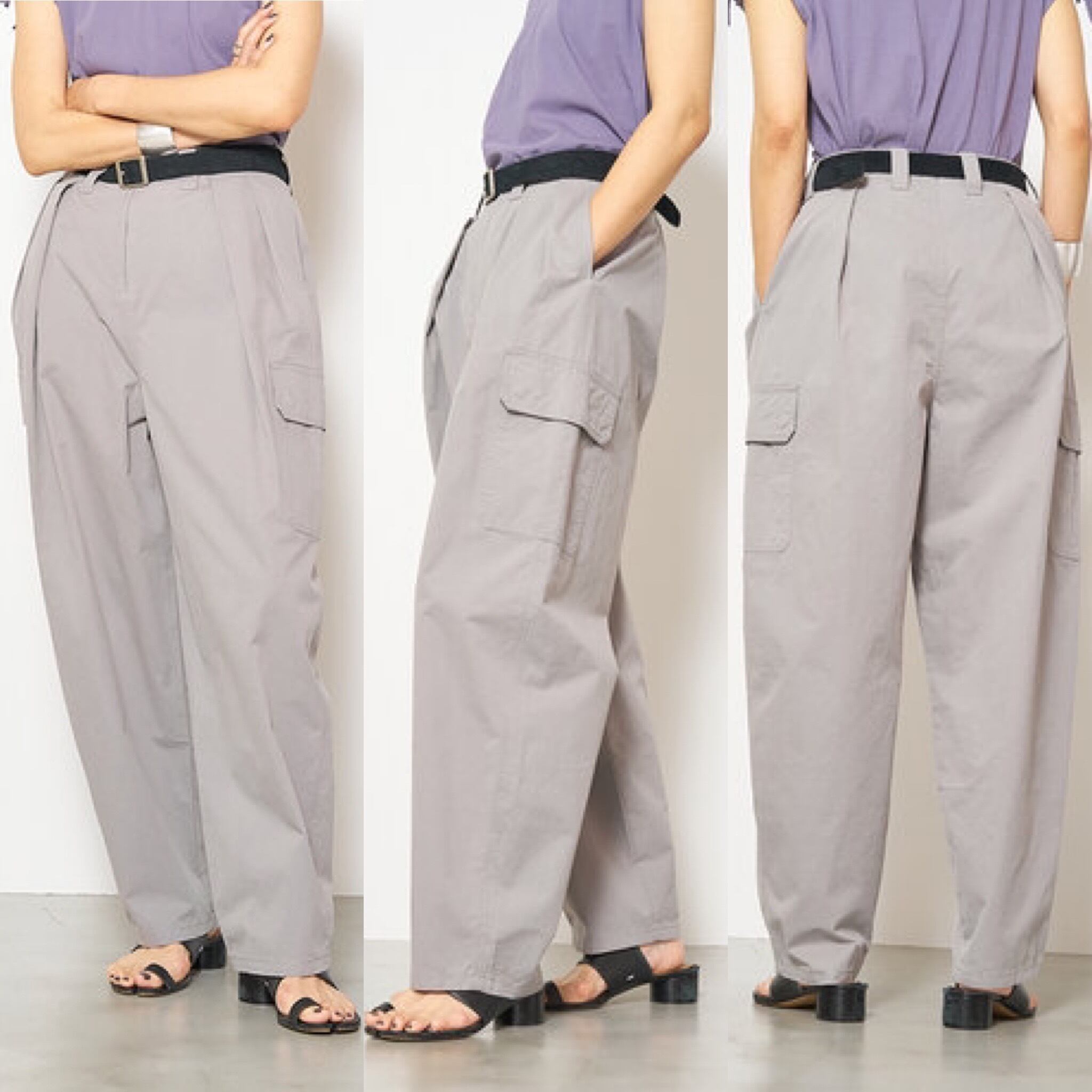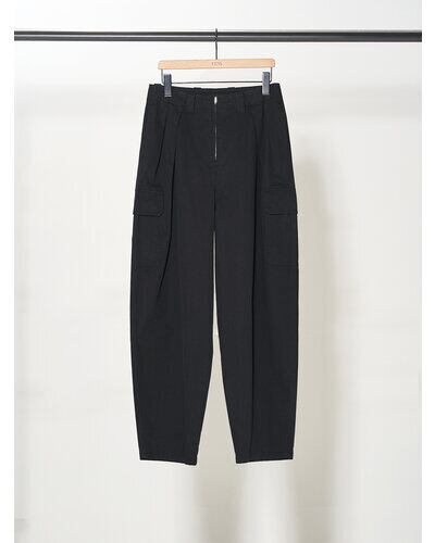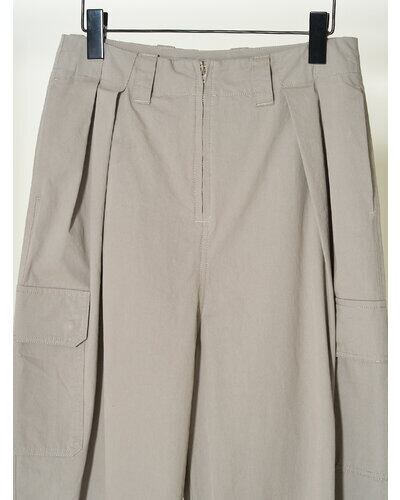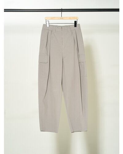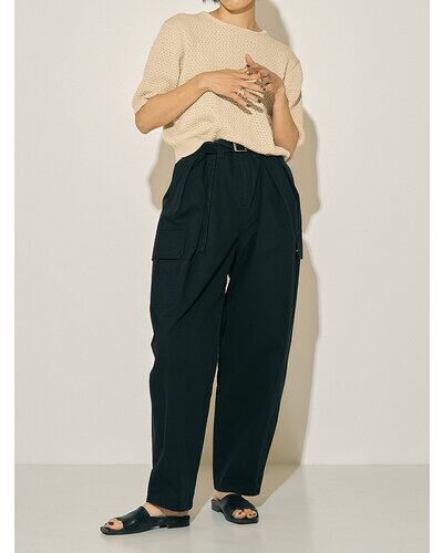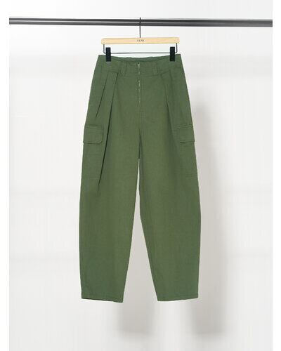 深めのタックを前後に施して作るふんわりと膨らんだバルーンシルエットが特徴で、古着のようなオーセンティックな印象ながらも女性らしさもあるカーゴパンツに仕上げています。 綿がごわつかないように強めに加工を入れているので肌馴染みも良く、着心地にもこだわって作りました。 ボリュームのあるボトムとコンパクトなトップスのバランスが今の気分にぴったりの1枚です。