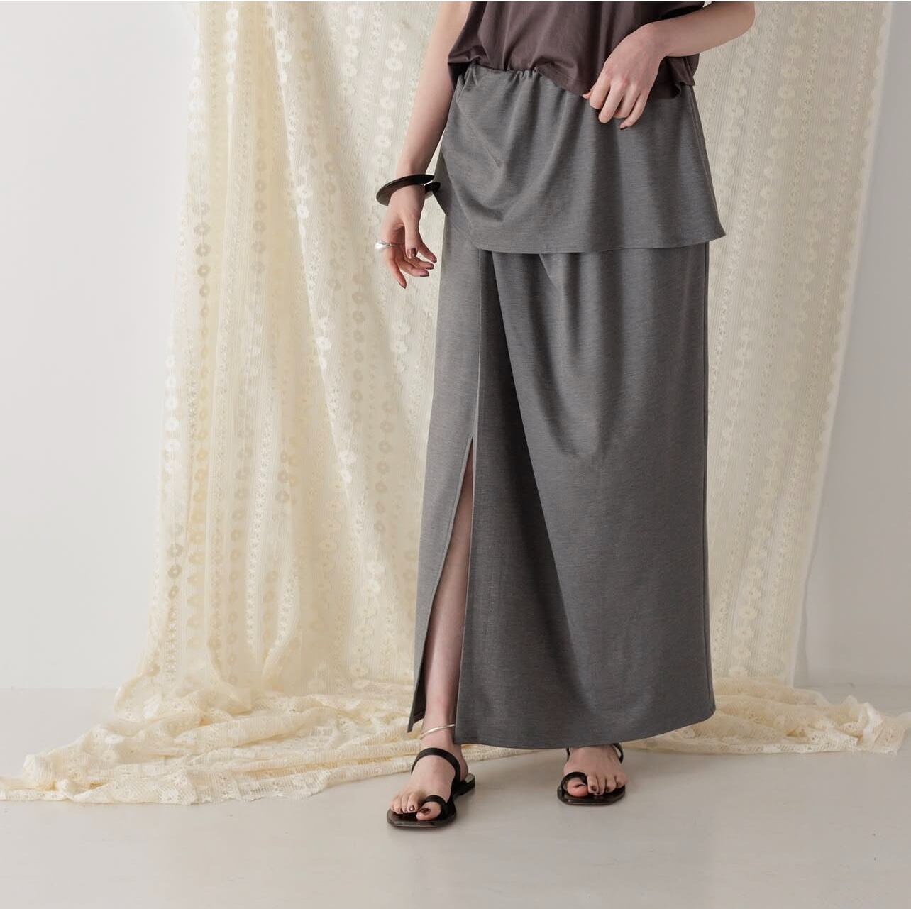 長さの違うスカートを二枚重ね履きしているようなデザインがポイントのスカートです。
