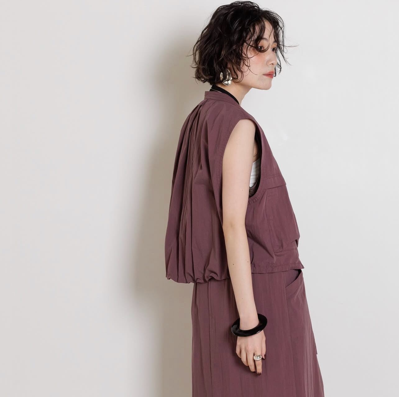 フロントにタテ落ちするタックドレープを施した、大人っぽく女性らしいシルエットにこだわりました。
