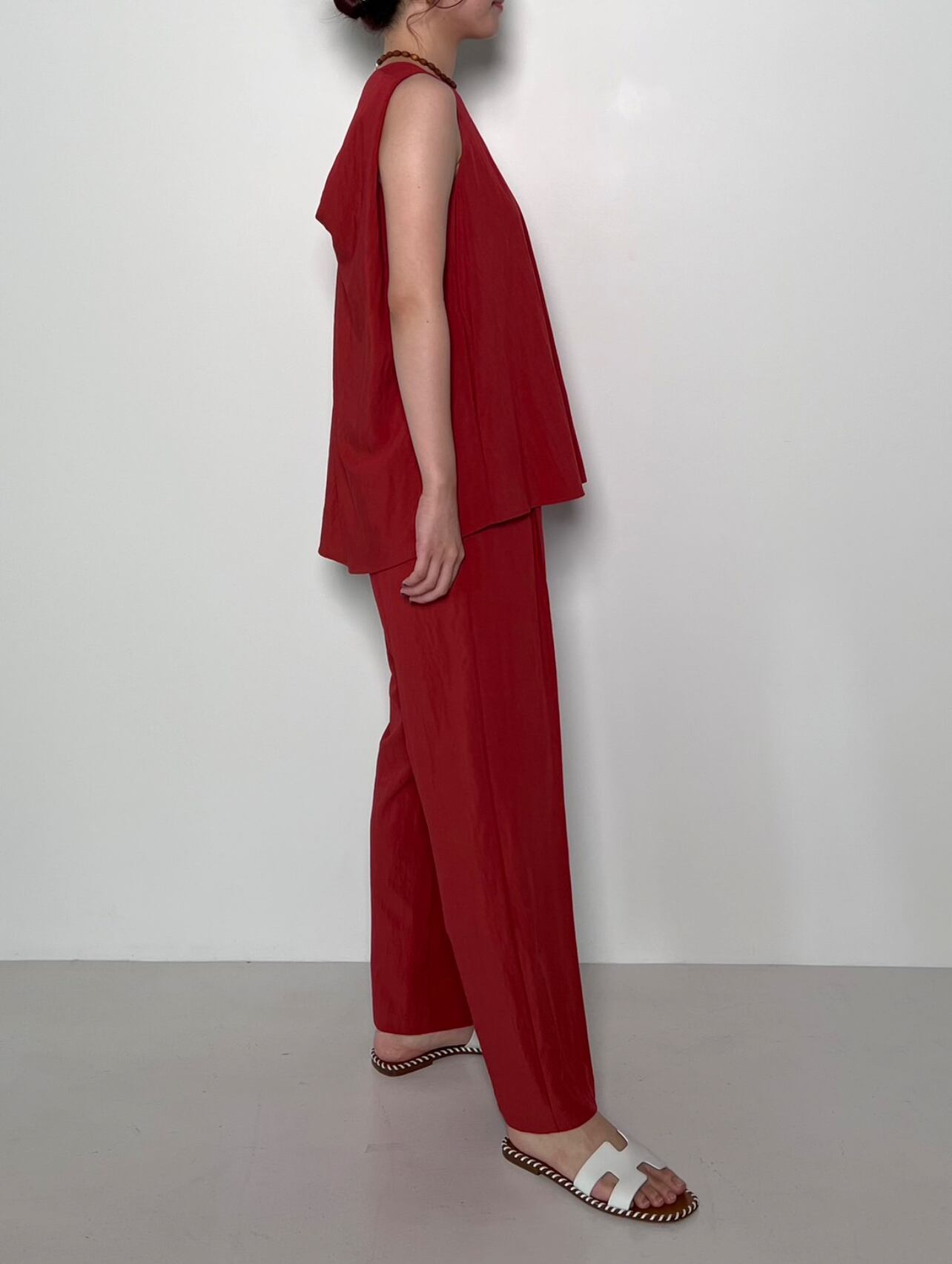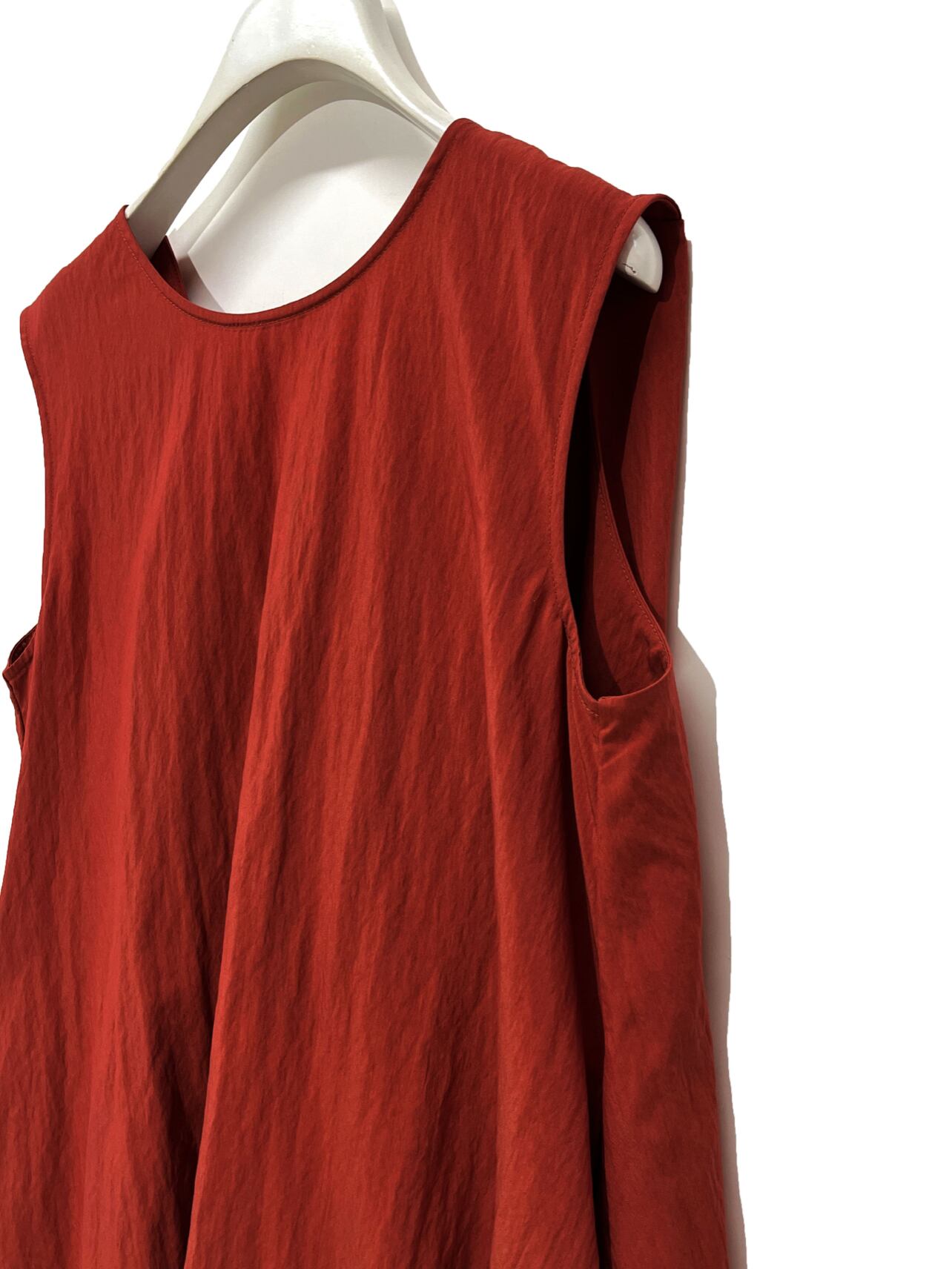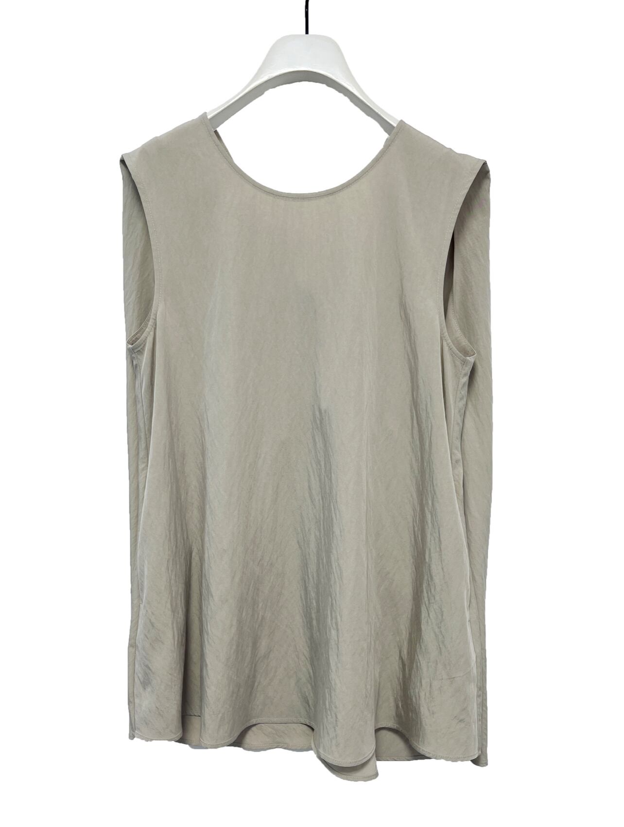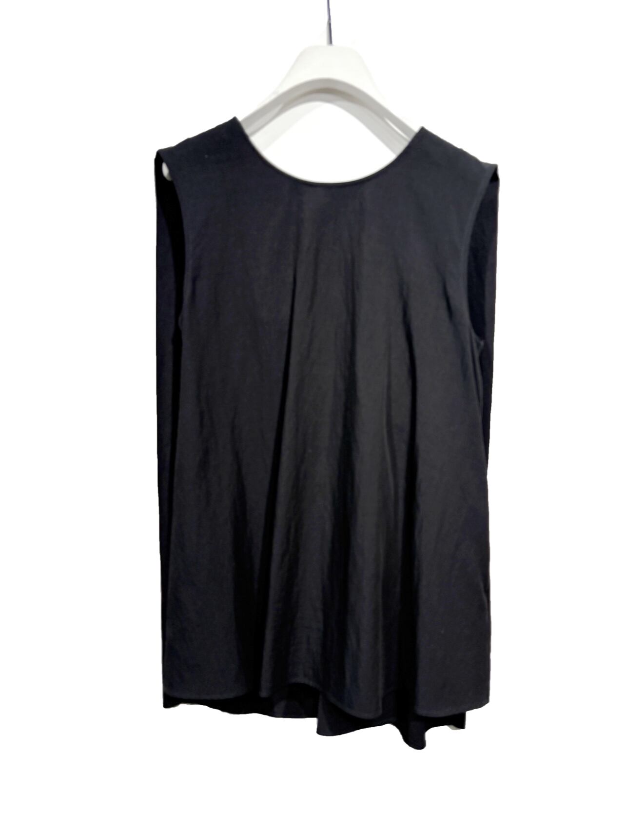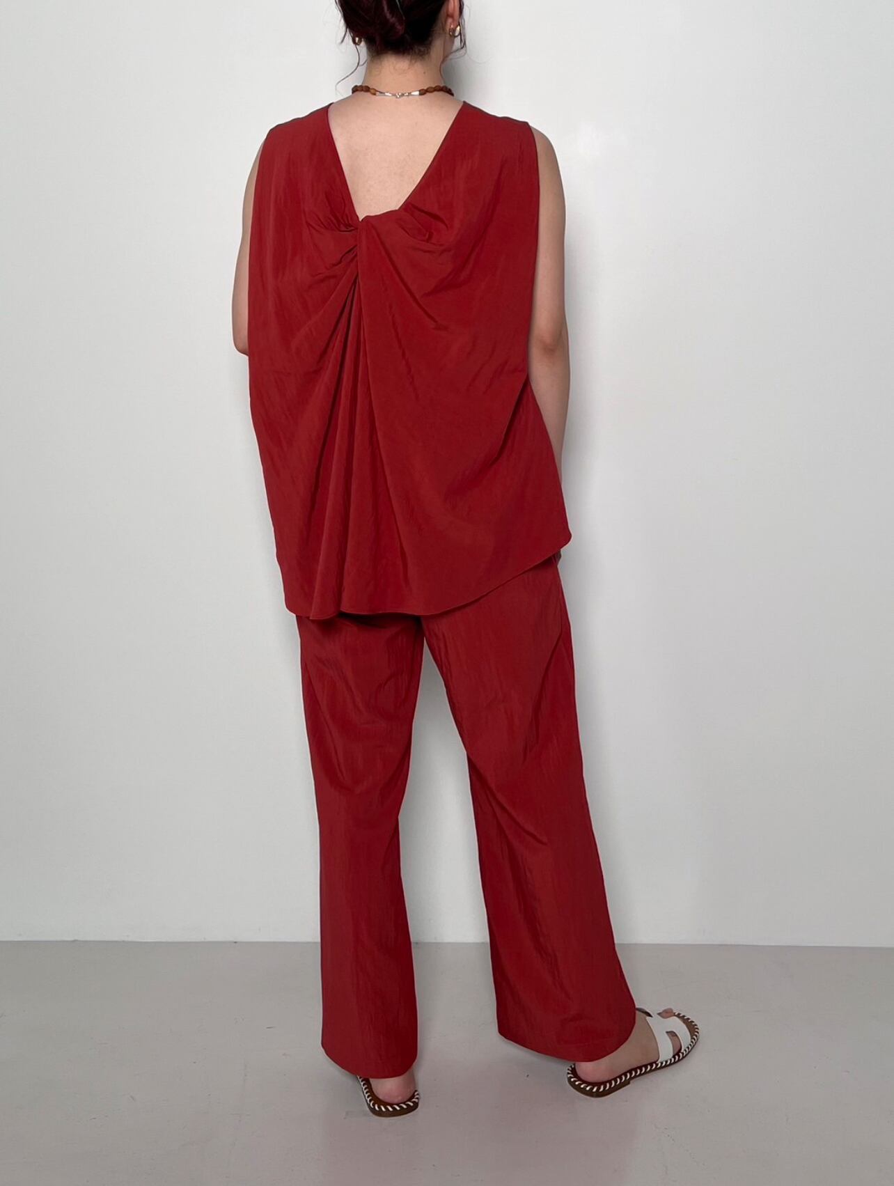 後のツイストデザインがポイントのノースリーブブラウスです。 ほどよい弾力感と洗いをかけたような風合いが特徴のレーヨン素材を使用。清涼感があり肌離れも良いので夏にぴったりの素材です。前から見たらシンプルなブラウスですが、後のドレープデザインがインパクトがあり少しおしゃれをして出かけたい場でもぴったりの1枚です。大人の女性も着用しやすいよう、肩周りが出すぎないように設計しています。