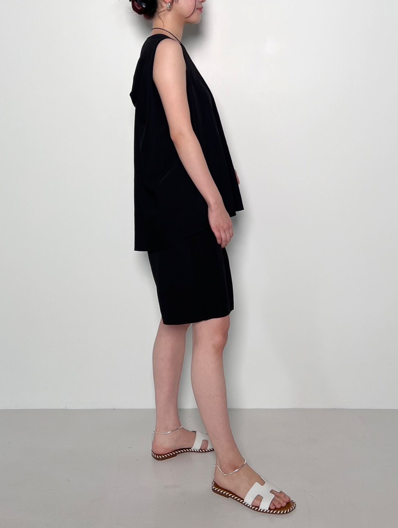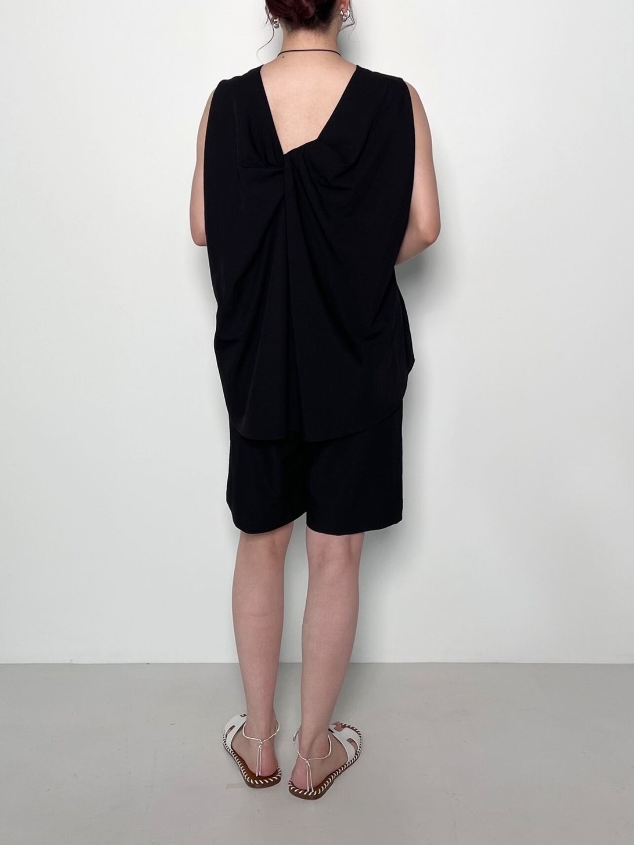 センタープレス風のステッチがポイントのイージーショートパンツです。ウエストのタックから自然に落ちるラインは、立体的になるようにステッチを入れました。ほどよい弾力感と洗いをかけたような風合いが特徴のレーヨン素材を使用。清涼感があり肌離れも良いので夏にぴったりの素材です。ベルト裏に通した紐で調整可能です。大人でも着用しやすい丈感のショートパンツの提案で、同素材のバックツイストブラウスとのセットアップでの着用がおすすめです。