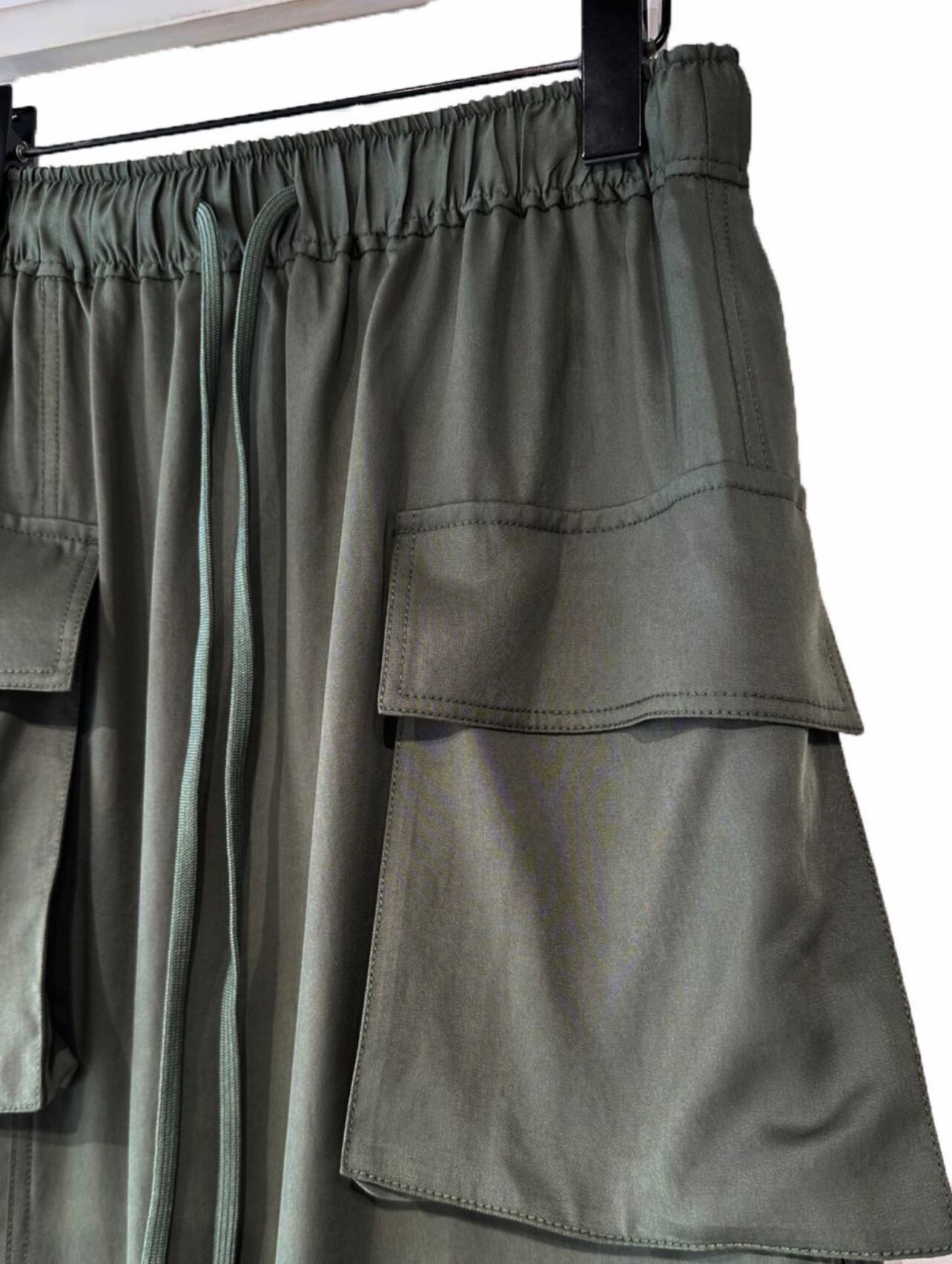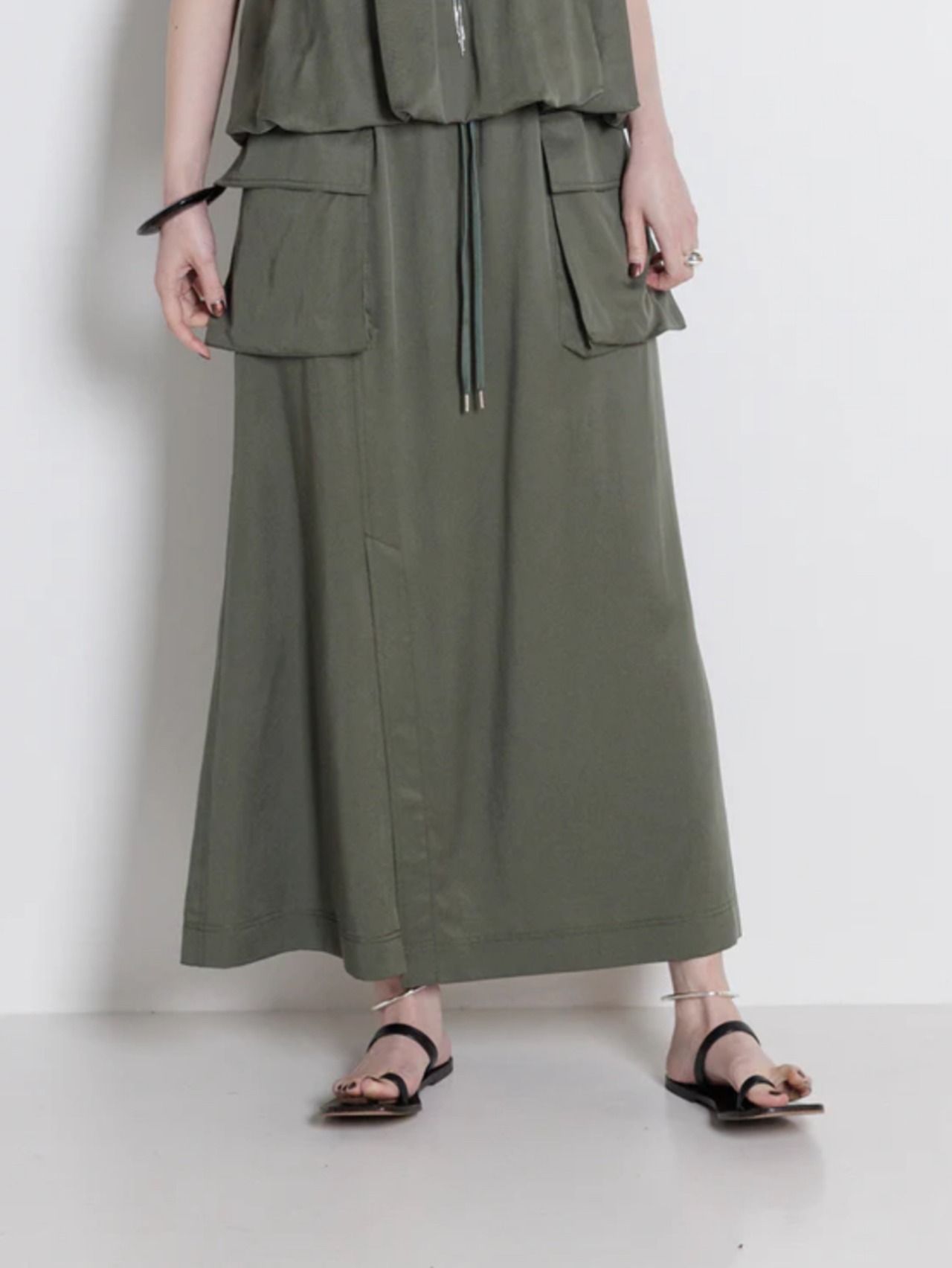カジュアルでありながら程よい光沢感のある素材を使用した、Aラインのカーゴスカートです。