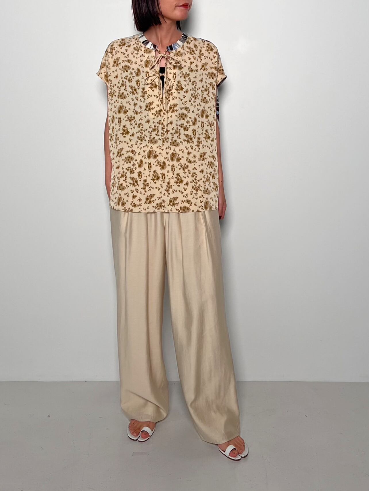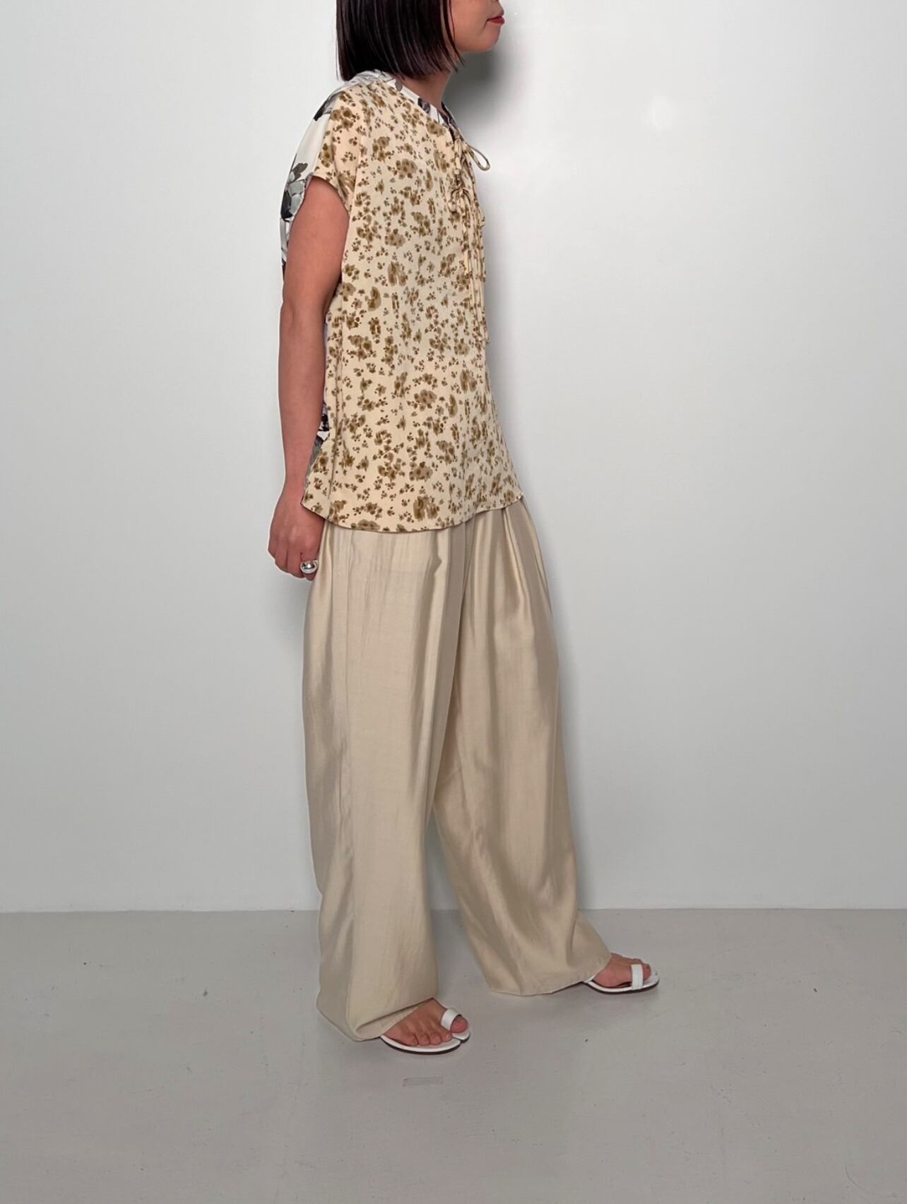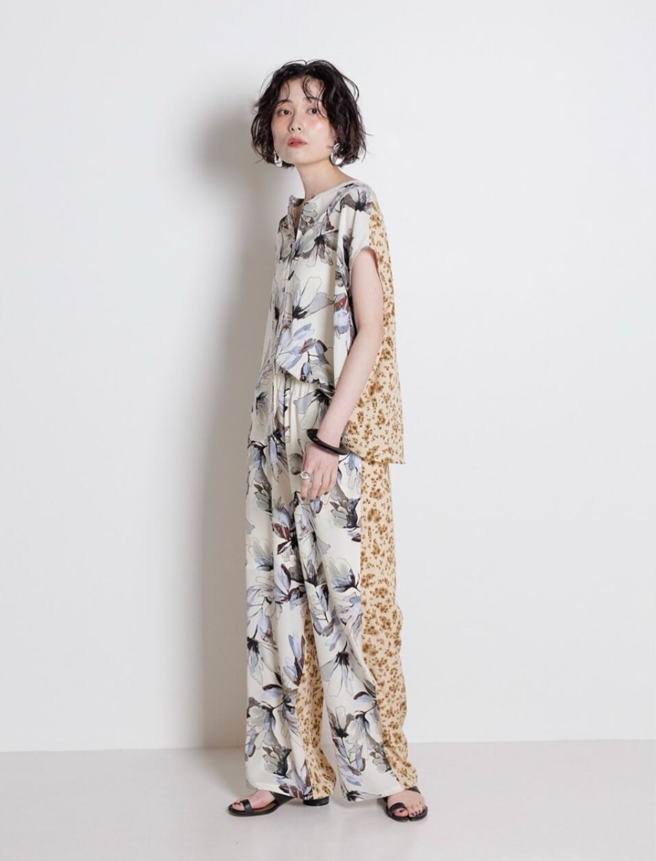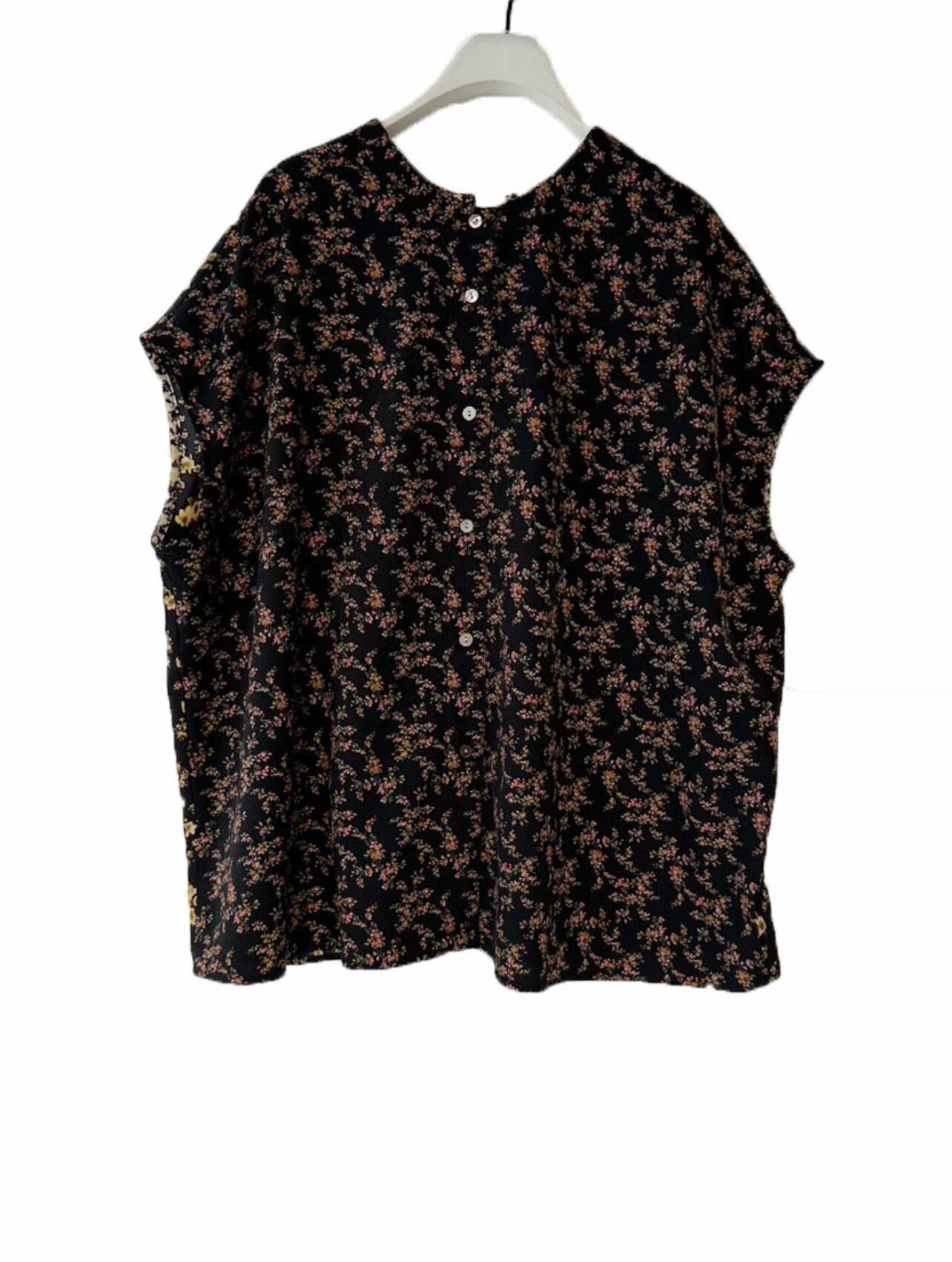 様々な花柄を組み合わせたパターンミックスのブラウスです。
