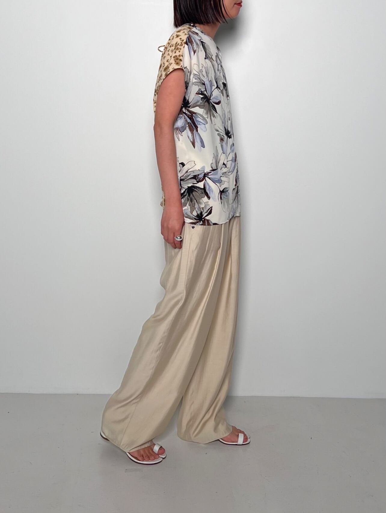 前後に大胆に柄を切り替えたデザインは、スタイリングに遊びをプラスする1枚です。