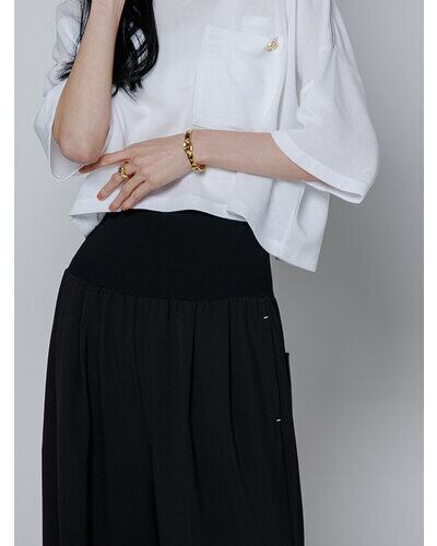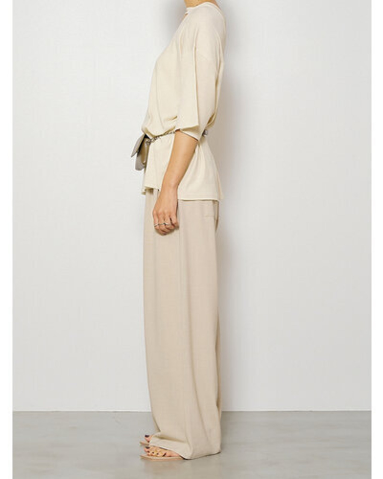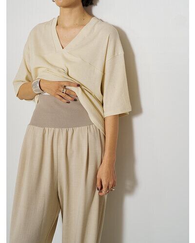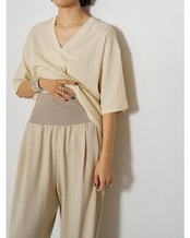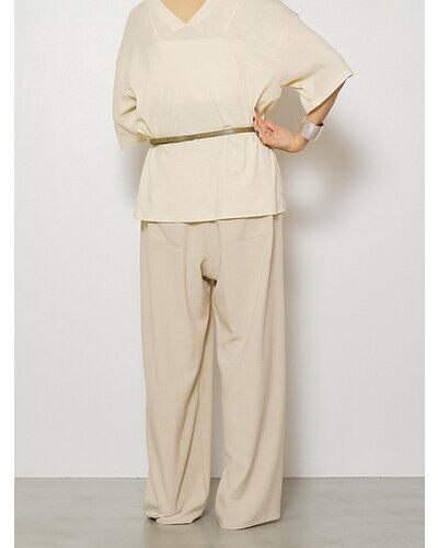ウエストに施した幅広のリブベルトが特徴のワイドパンツで、麻調の節のある軽やかなTR素材を採用、イージーに着やすいワイドシルエットのボトムは夏におすすめの1枚です。幅広のリブベルトは胸下まで伸ばしたり、折り返したり、さまざまな着こなしが楽しめます。 トップスをインするとコルセットのようなデザインになります。