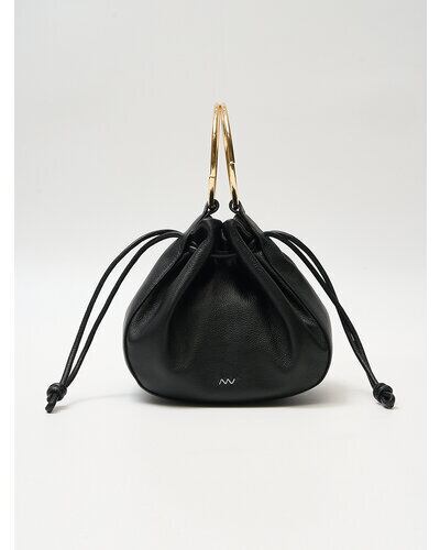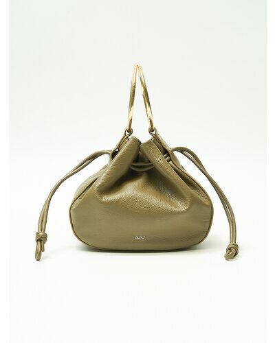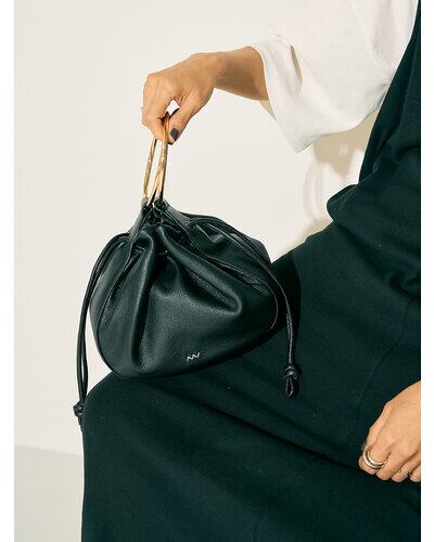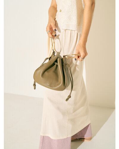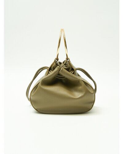 大きなゴールドのリングハンドルがポイントの巾着型バッグです。