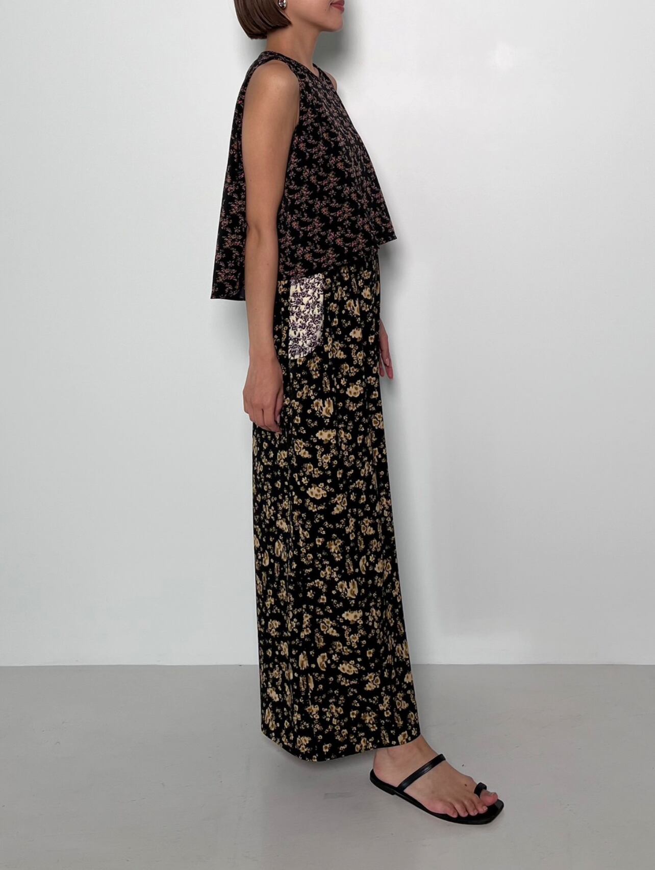 TOPとSKIRTで大胆に柄を切り替えたレイヤード風のデザインで、ポケットにも別の柄を配置して遊びをプラスしました。