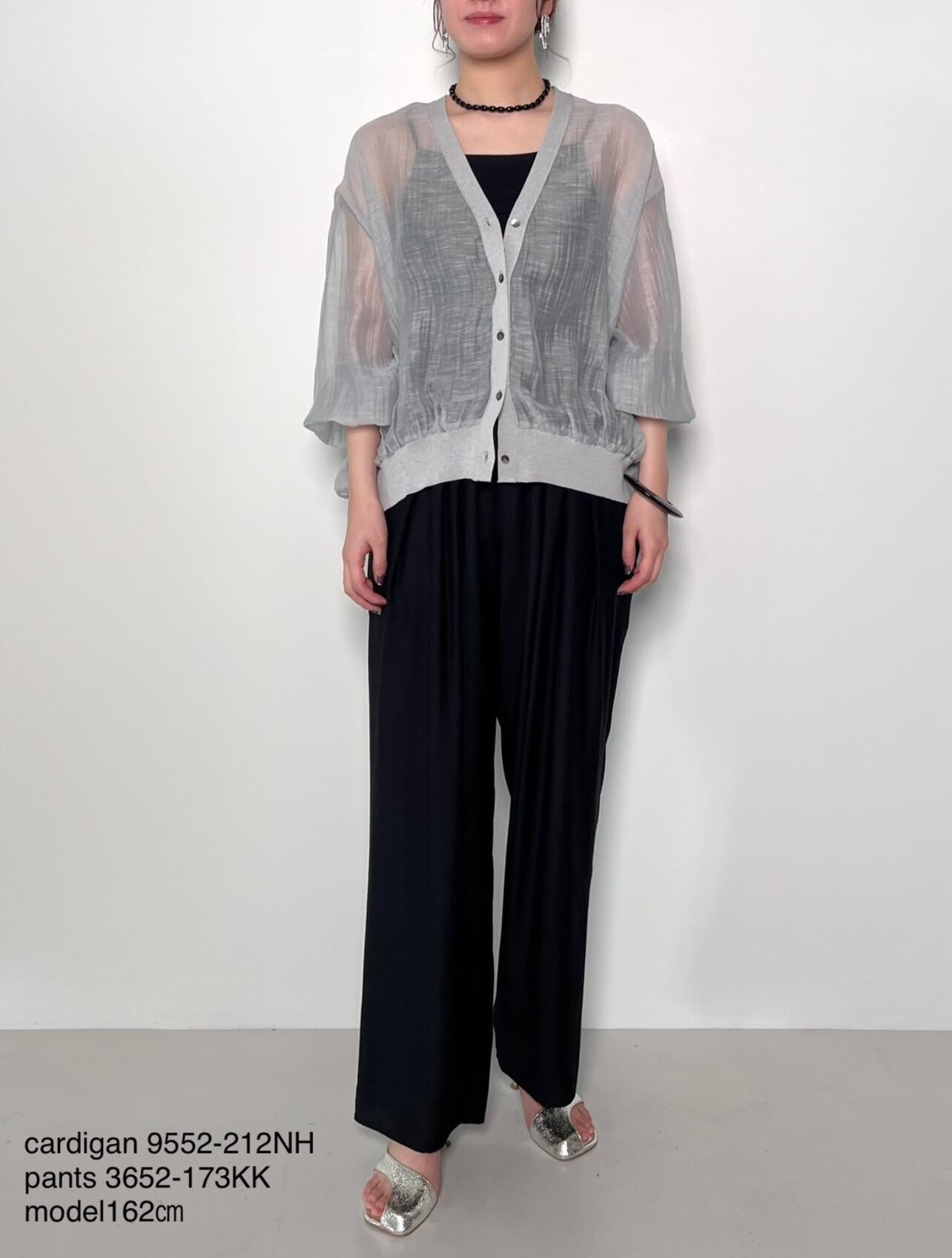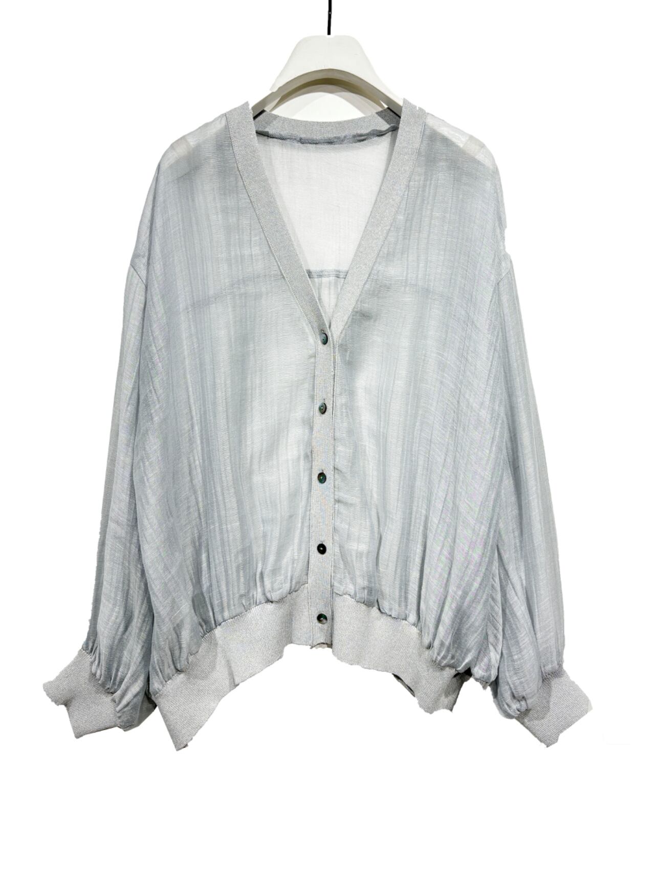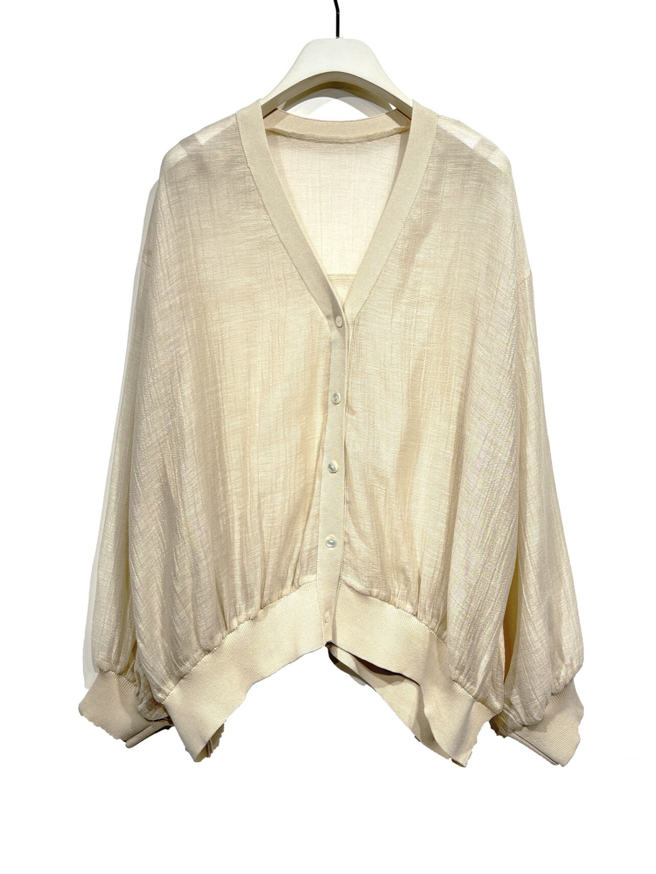 一見はニットのカーディガンに見えますが、身頃と袖はブラウスのようなシアーな布帛を使用しているので、
