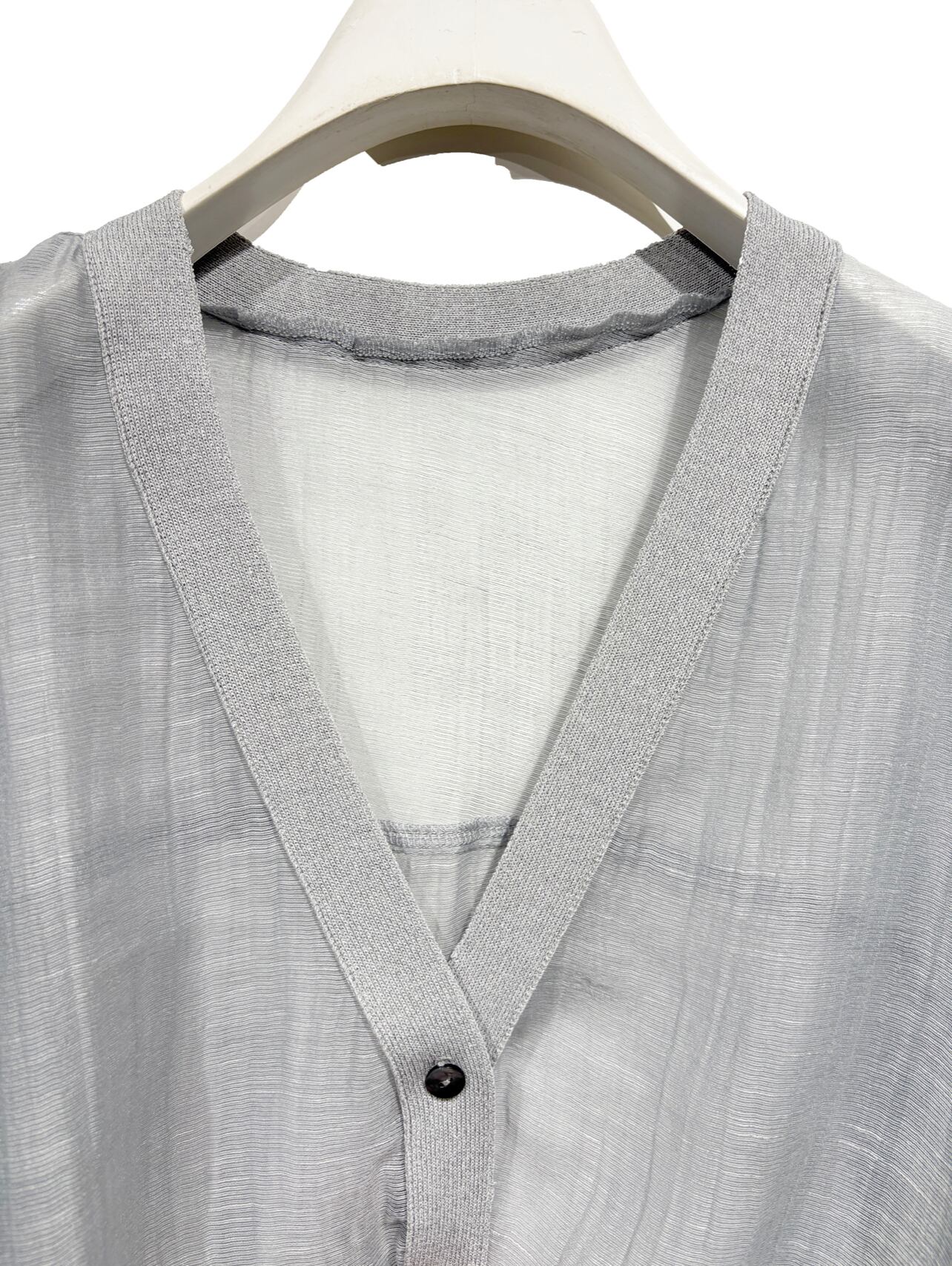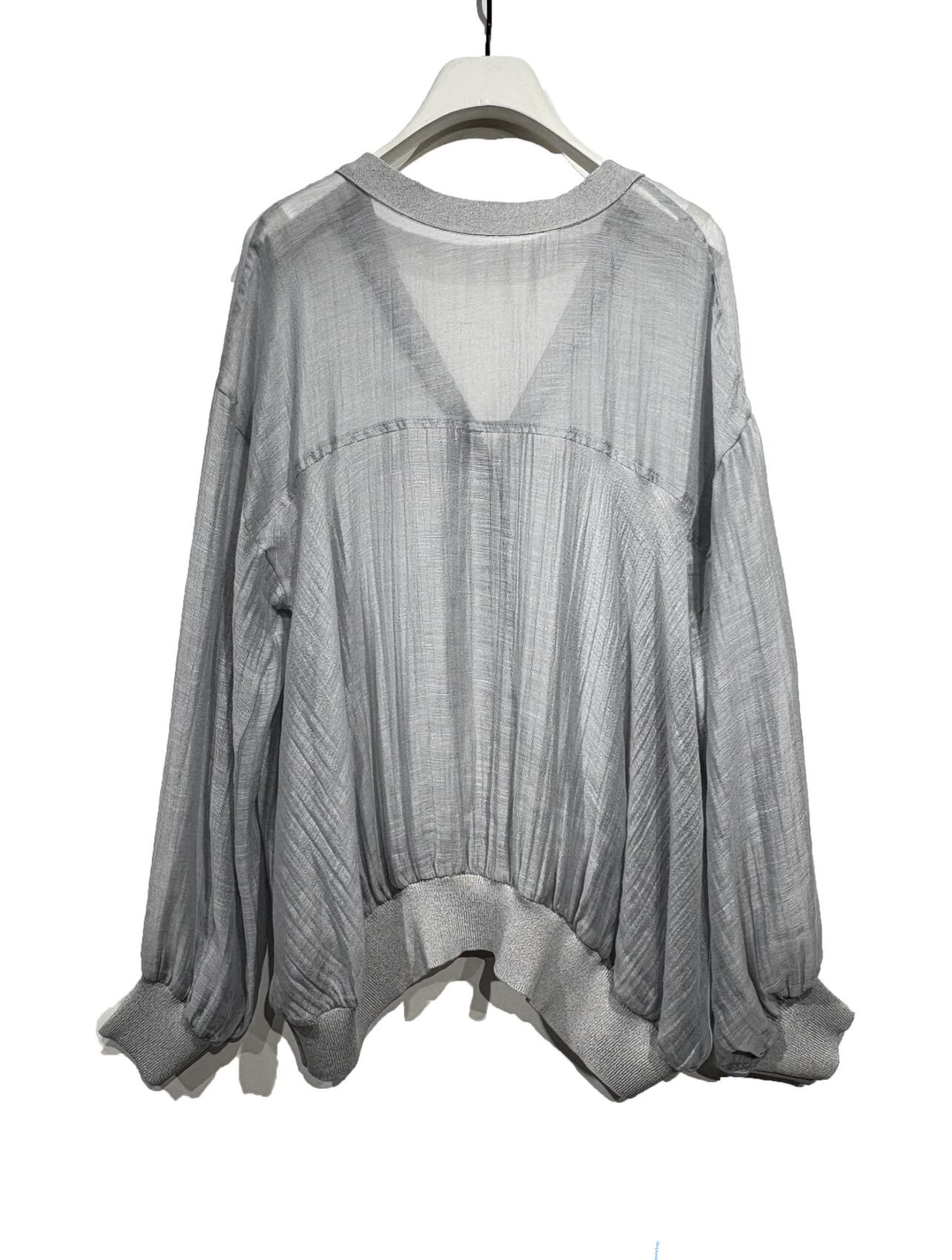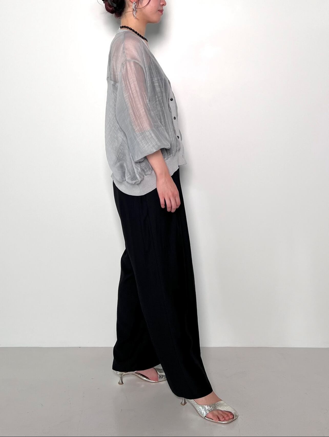 一見はニットのカーディガンに見えますが、身頃と袖はブラウスのようなシアーな布帛を使用しているので、