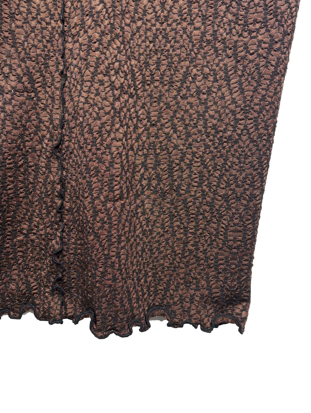 メローロック始末による、裾やフロントの生地端が波打ったデザインもポイントになっています。