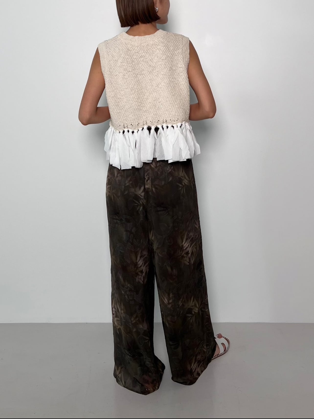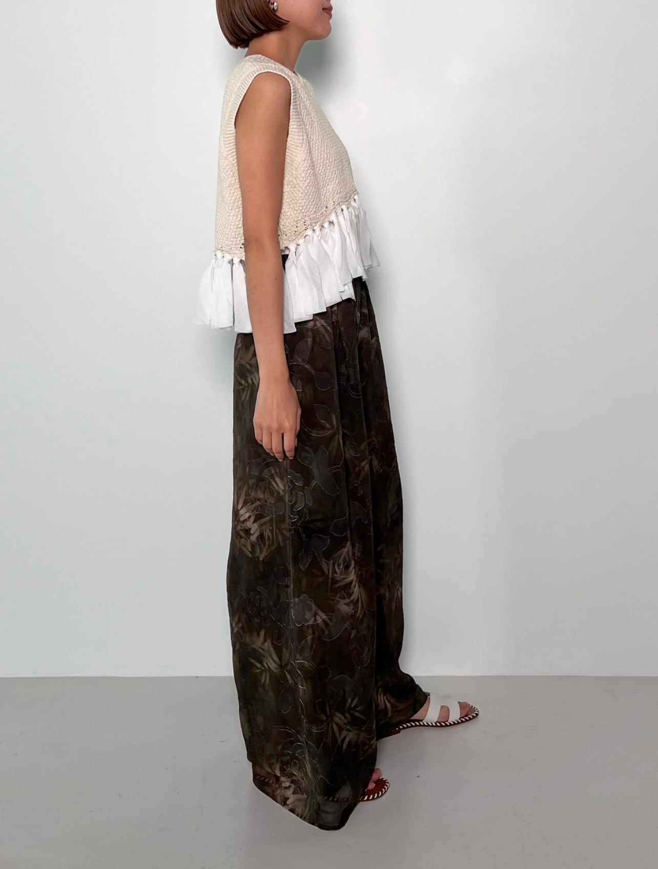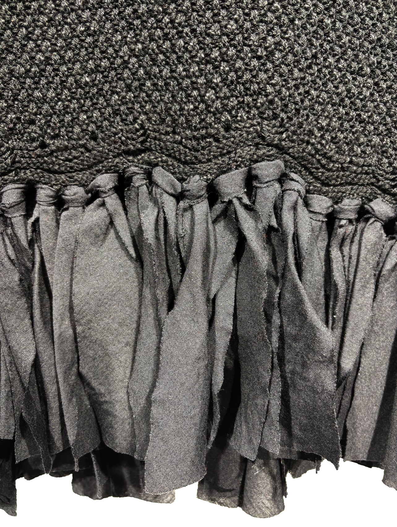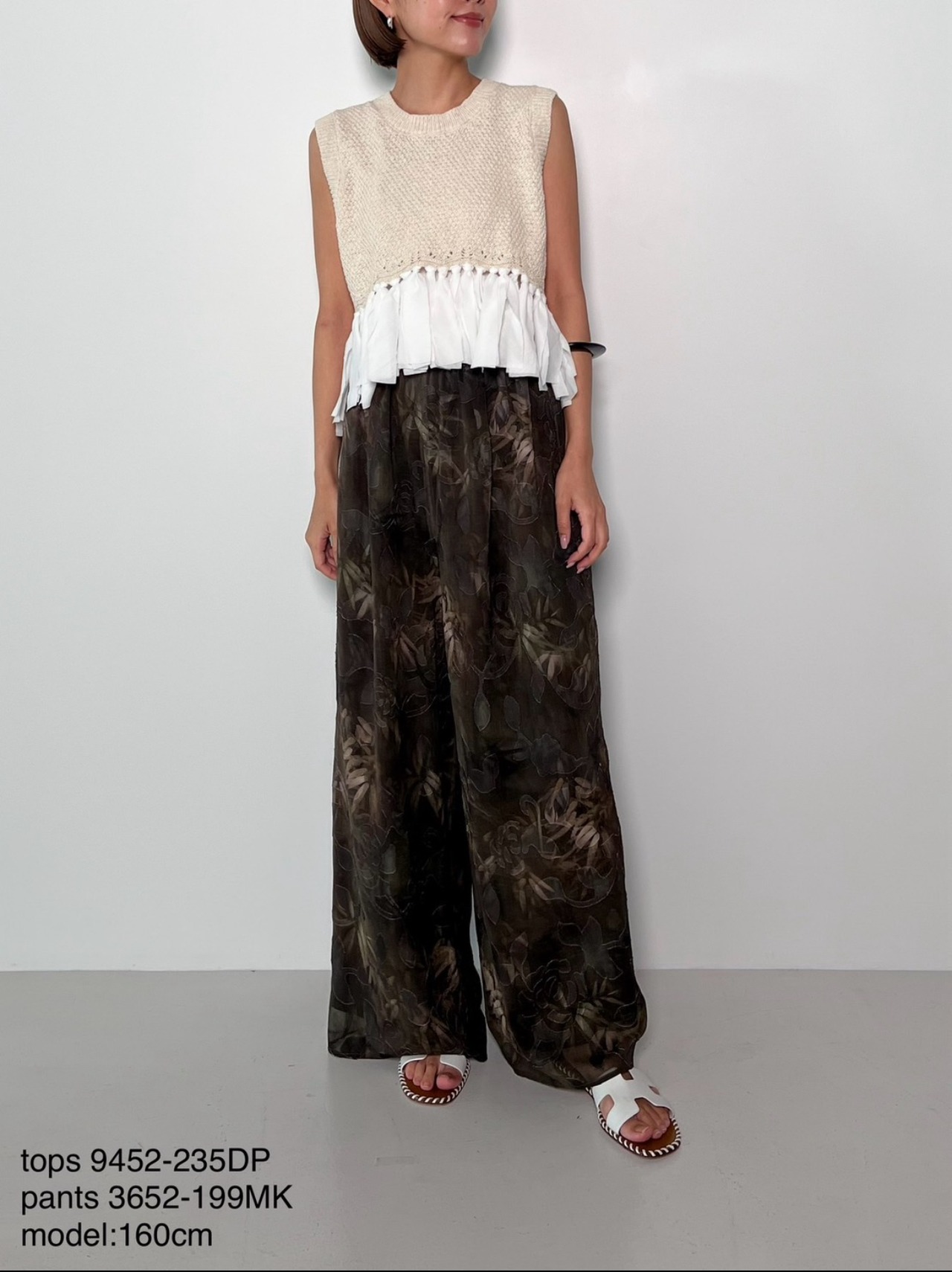 身頃には表情感のあるスラブ綿糸をさらに鹿の子編みで表面を凹凸させ、下部分には軽く柔らかいガーゼのような綿生地をドッキングし変化のあるデザインに