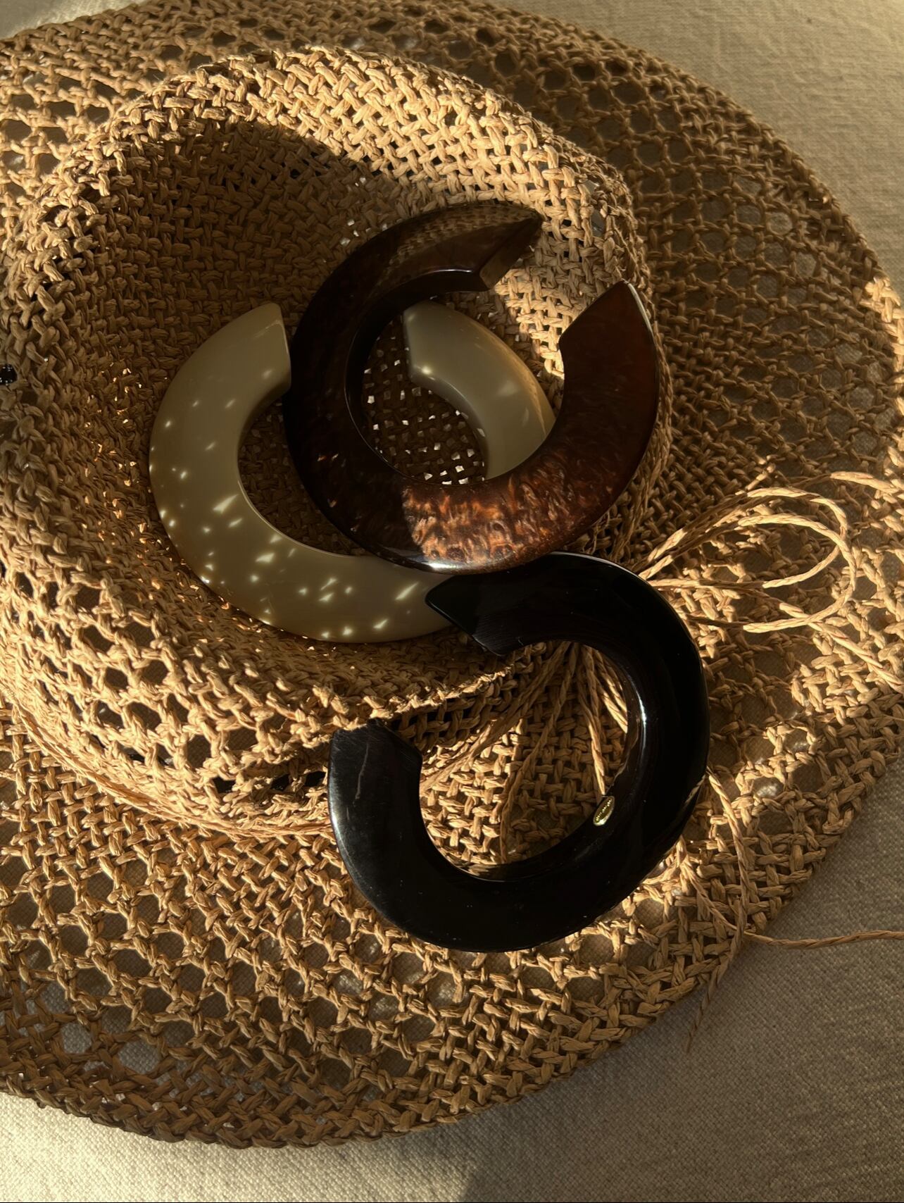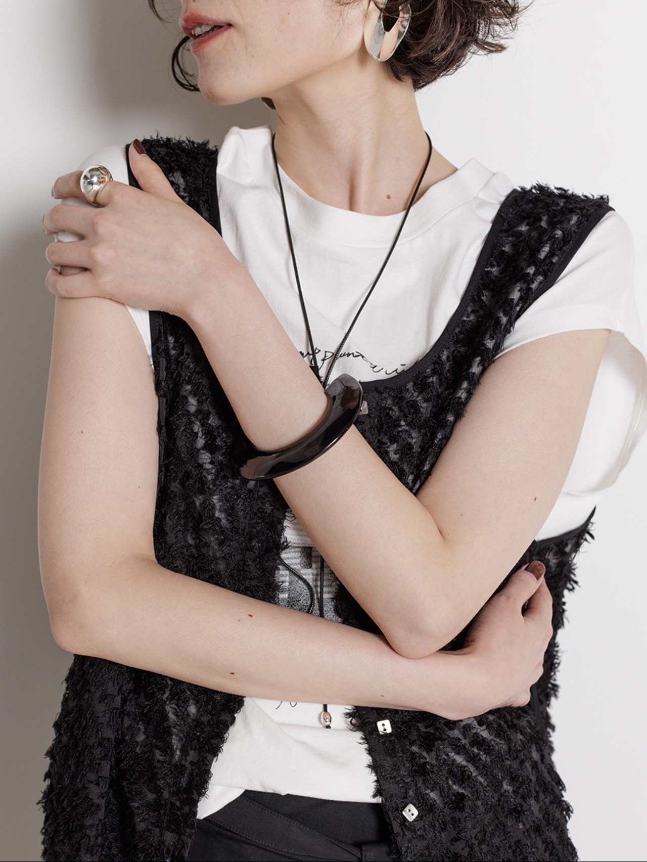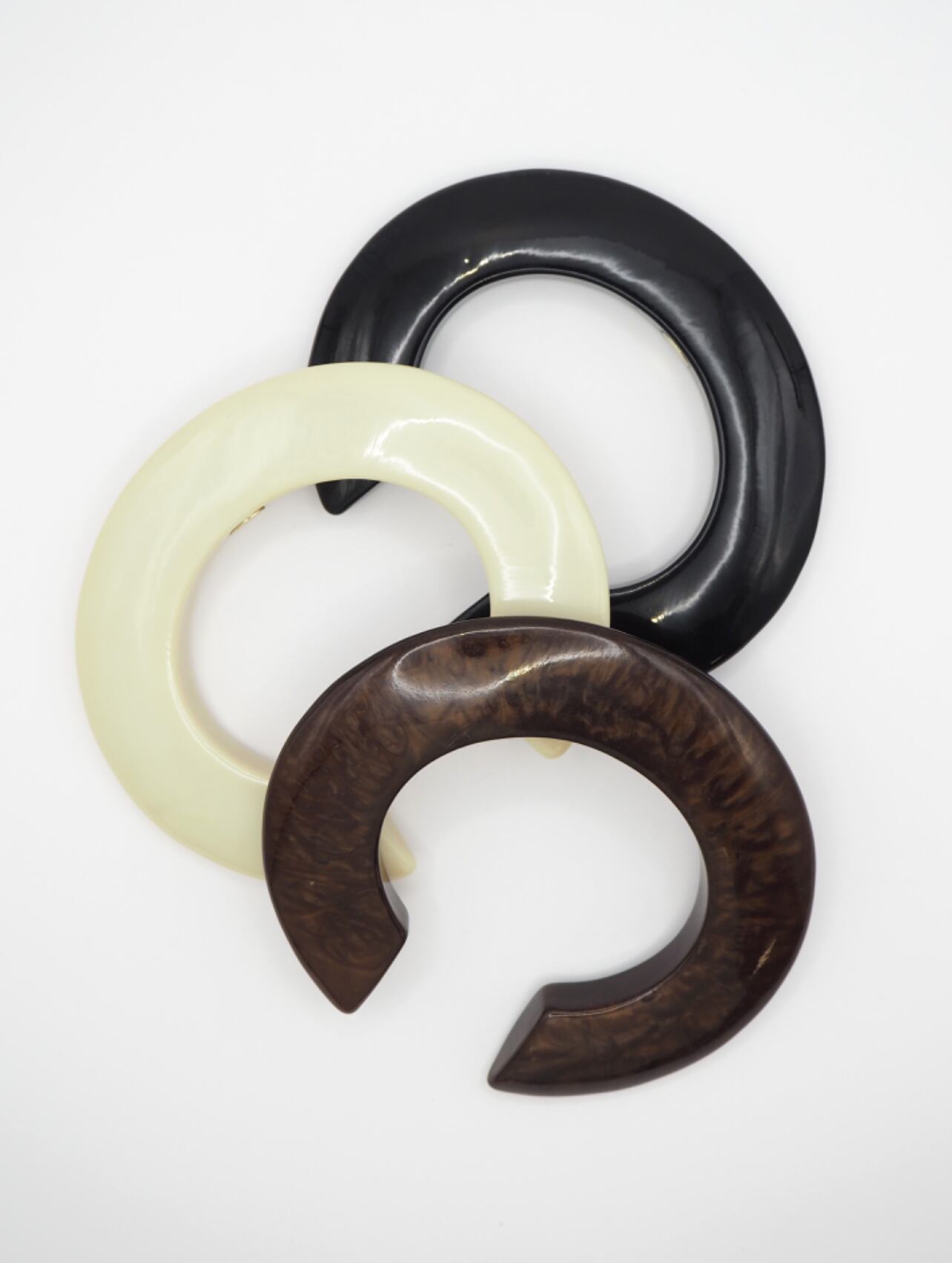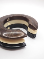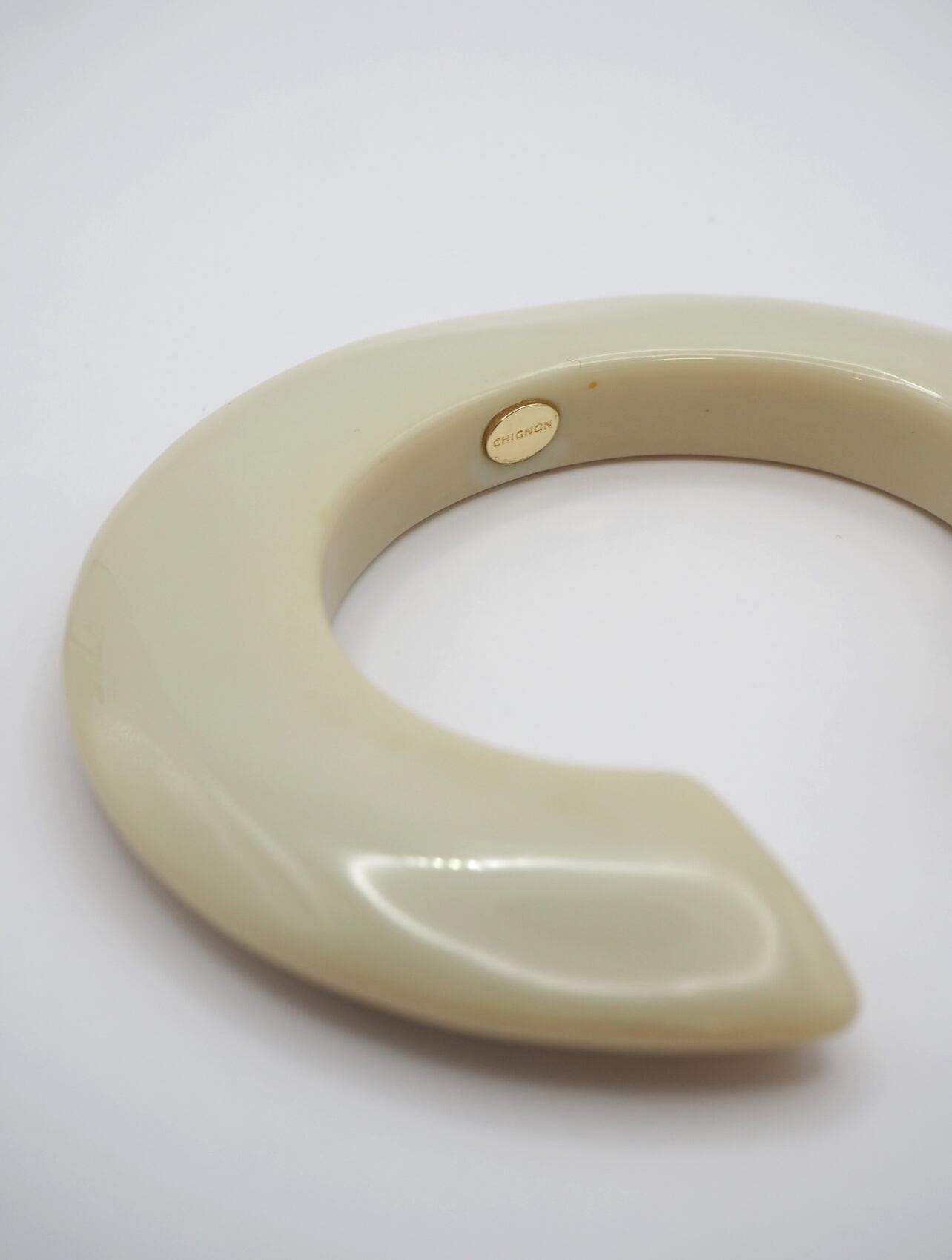 肌なじみの良いアイボリー、絶妙な大人ブラウンマーブル、どんな服にも合わせやすいブラック、それぞれ落ち着いたカラーが印象的なホマイカ樹脂バングル。オリジナルのC型バングルの内側にはCHIGNONの刻印入りプレートが付いているので、着用時にちらっと見えるメタルプレートはグレード感をよりアップさせてくれます。手首にさっと着けるだけでコーデのアクセントになり存在感も抜群、お手持ちのメタルバングルやブレスレットと合わせても◎金属アレルギーの方もお肌を気にせずお洒落を楽しめるアイテムです。マーブル模様は1つ1つ職人によって製作されている為、個体差がございますので予めご了承ください。