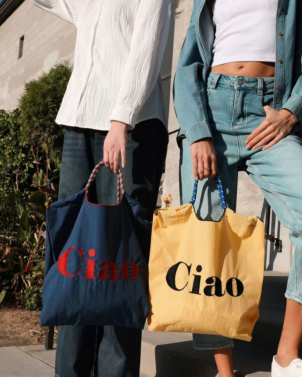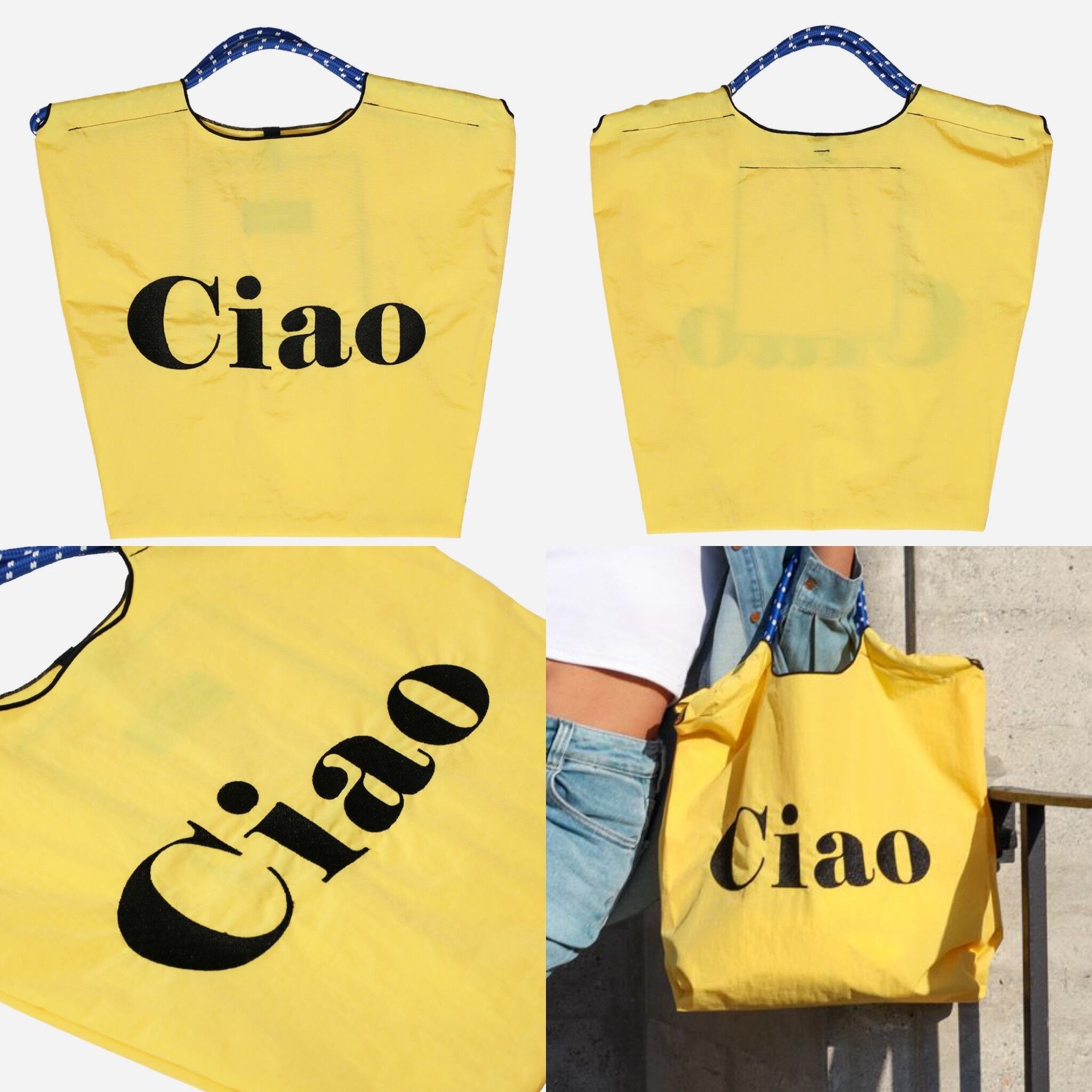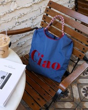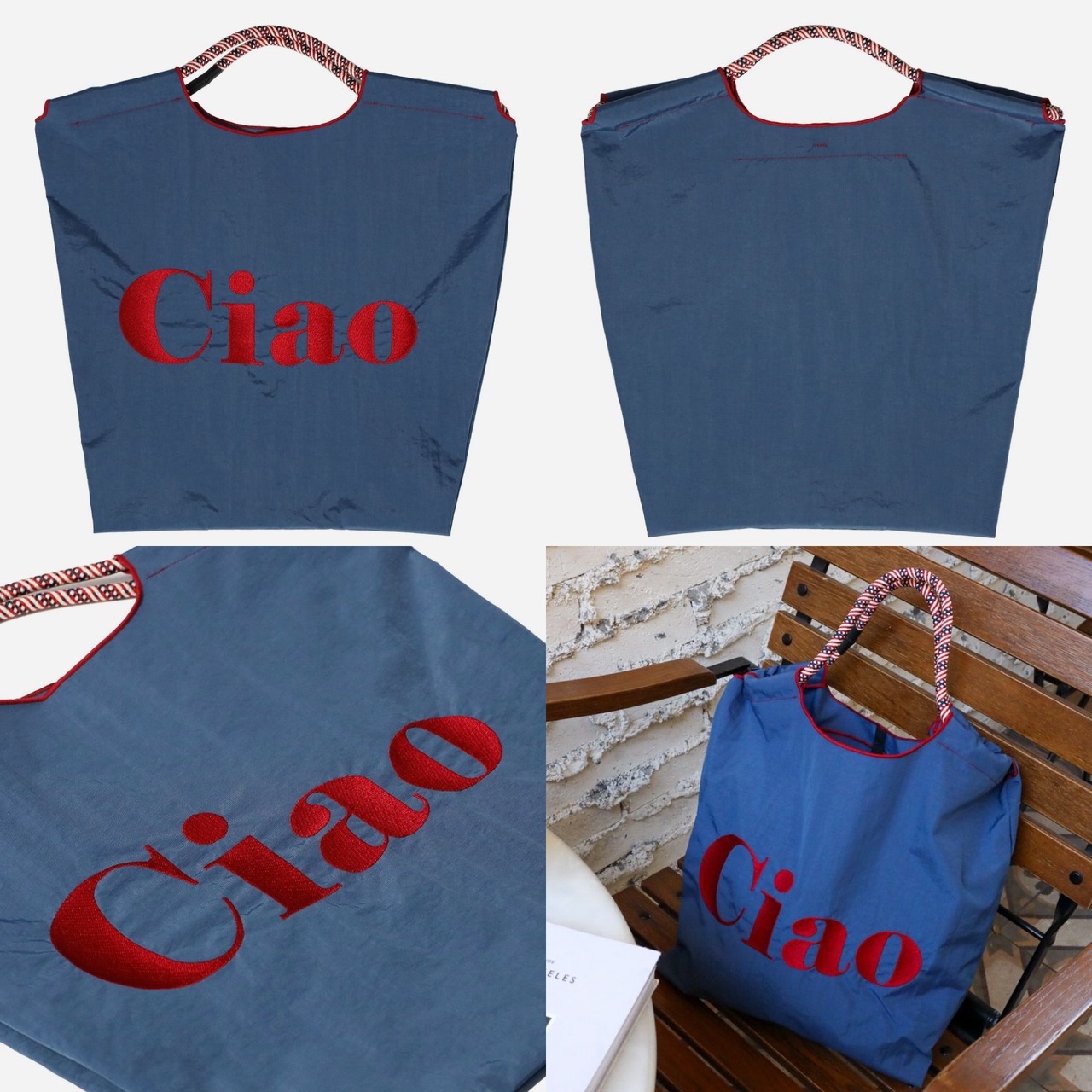 シンプルで印象的な「Ciao」のロゴが特徴的なカジュアルトートバッグです。軽量で丈夫な素材を使用しており、デイリー使いや旅行のサブバッグとして最適です。大容量のサイズ感で、雑誌や日用品もすっきり収納できます。