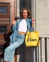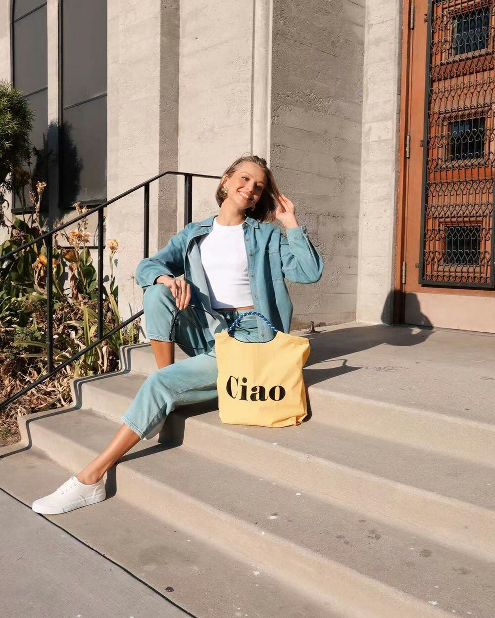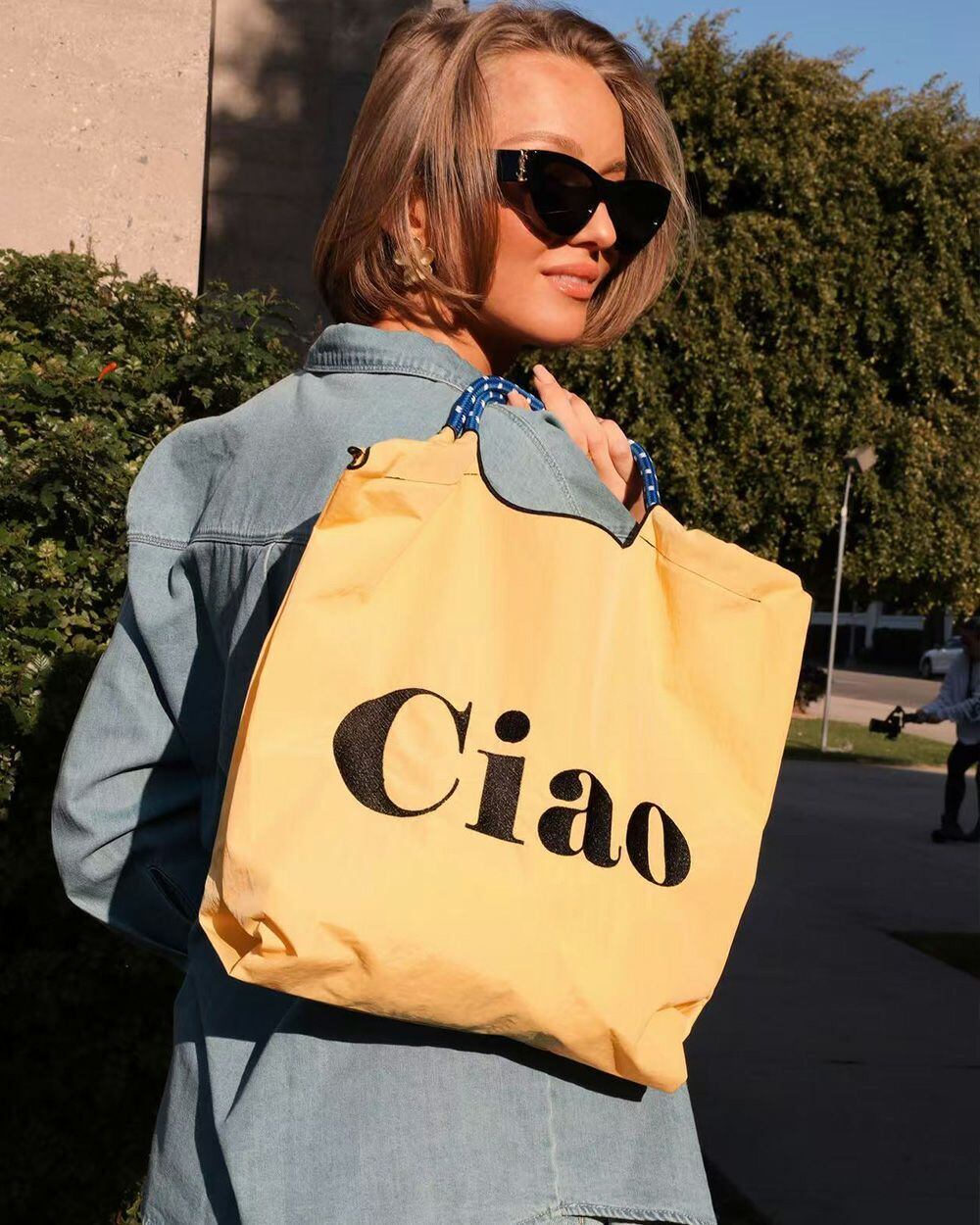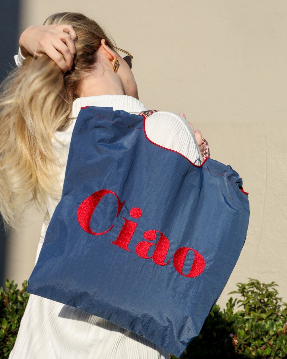 シンプルで印象的な「Ciao」のロゴが特徴的なカジュアルトートバッグです。軽量で丈夫な素材を使用しており、デイリー使いや旅行のサブバッグとして最適です。大容量のサイズ感で、雑誌や日用品もすっきり収納できます。